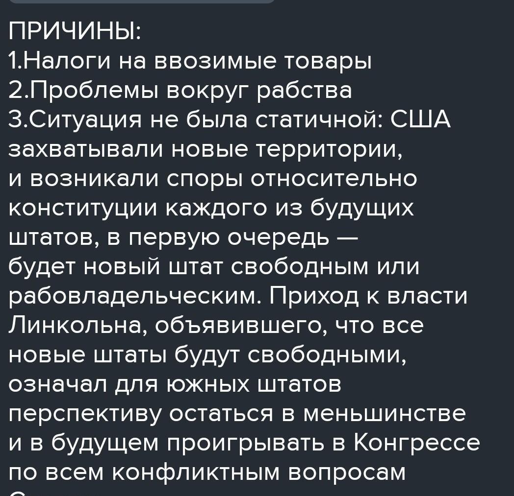1. Каким образом происходил территориальный рост США? 2. В чём заключа- лись особенности экономического развития США? 3. Почему сохранение рабства препятствовало прогрессу в экономике и политике? Дайте развёрнутый ответ. 4. Каковы причины Гражданской войны в США? Назовите её особенности и ре- зультаты.