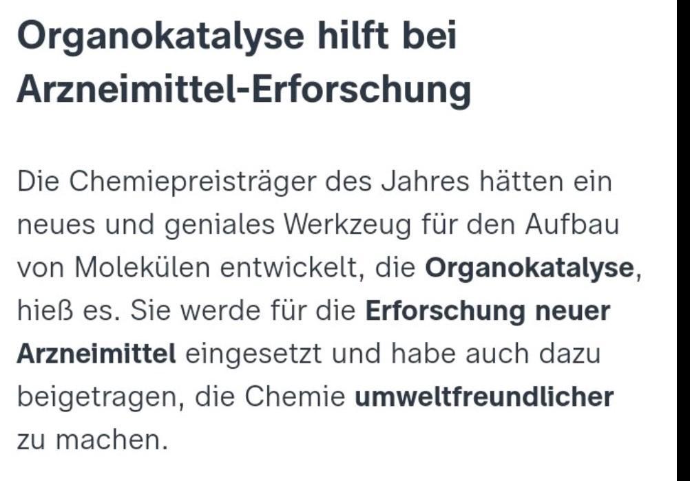 Лауреати року в галузі хімії розробили новий та винахідливий інструмент для побудови молекул - органокаталіз. Він використовується для дослідження нових препаратів, а також сприяв зростанню хімії більш екологічною.
