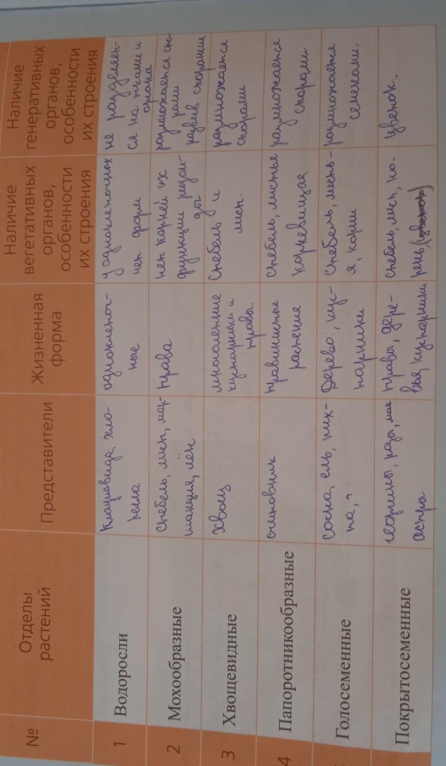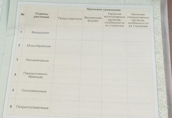 3. Среди гербарного материала выбирайте поочёредно представителей каждого отдела растений и выясняйте отличительные признаки растений этого отдела. По результатам своей работы заполните таблицу.