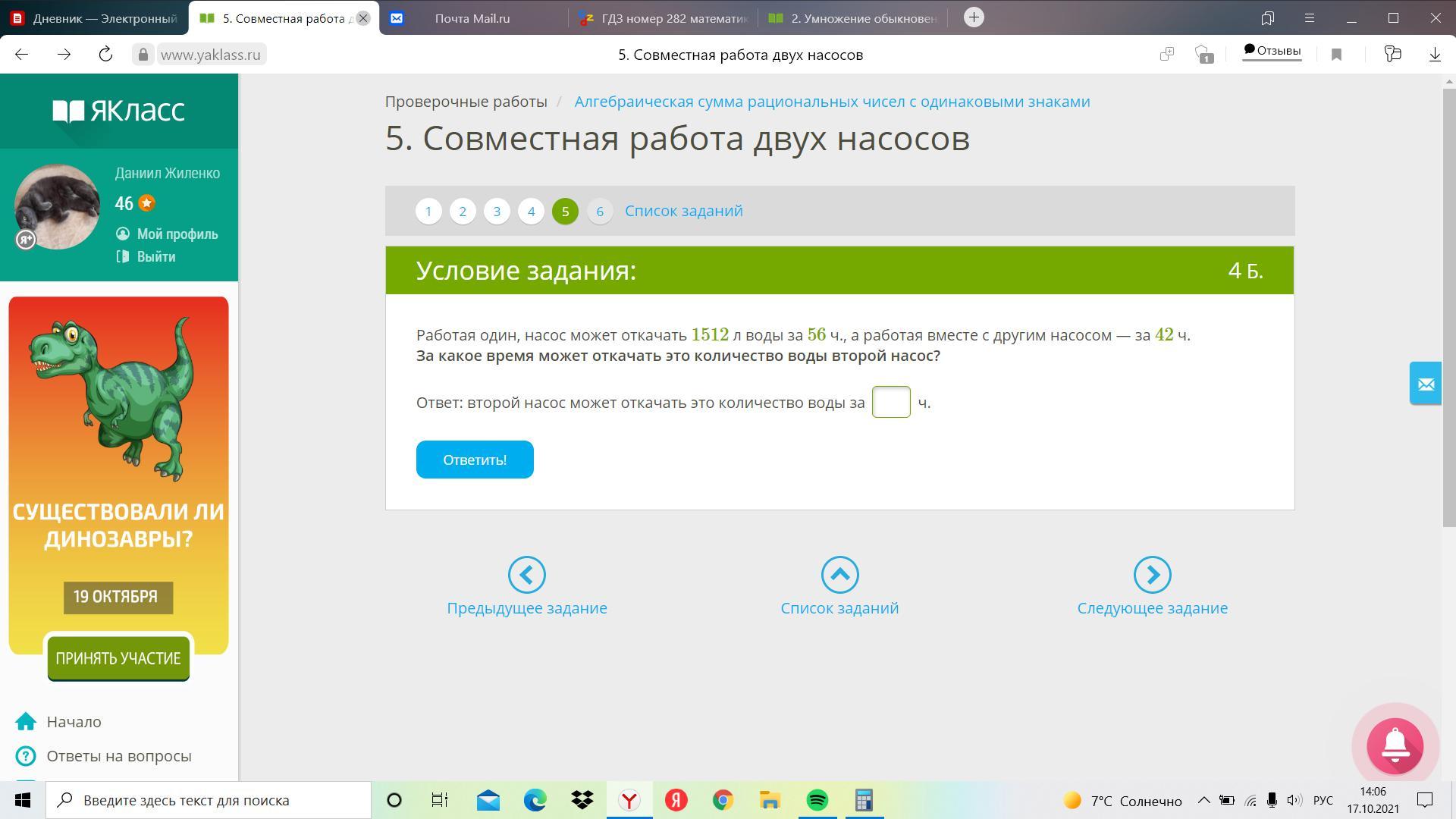 1512 литров/(А1 +А2) = 42 часа. Тогда, подставляя А1 получим, что А2 = 9л/ч. Теперь, окончательно, найдем время второго насоса: