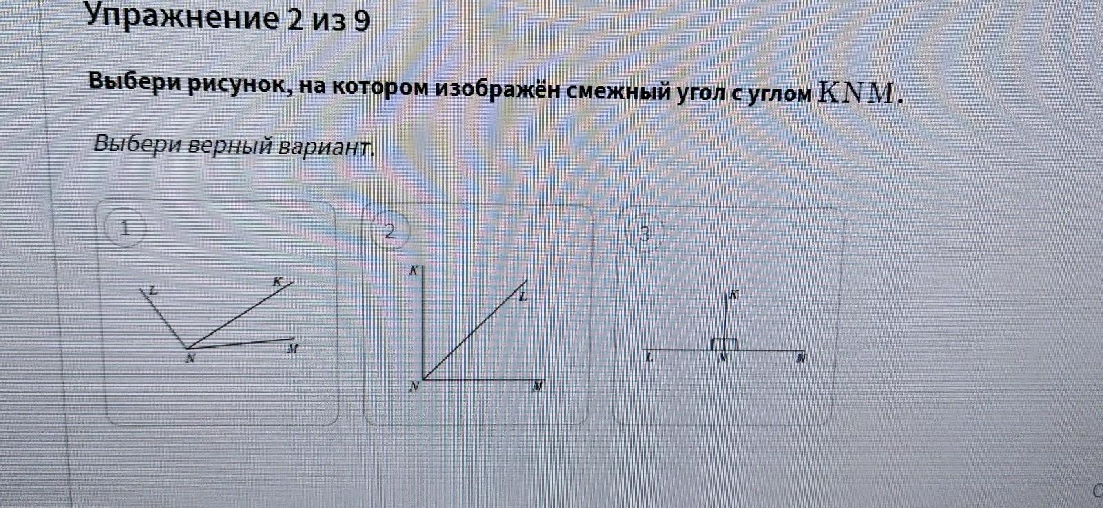 Упражнение 2 из 9 Выбери рисунок, на котором изображён смежный угол с углом KNM. Выбери верный вариант.