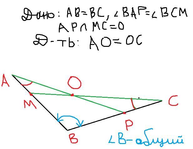 На равных отрезках АВ и ВС отметили точки М и Р соответственно так, что угол ВАР равен углу ВСМ. Отрезки АР и СМ пересекаются в точке О. Докажите, что АО=ОС. Помогите пж