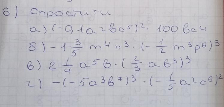 a)(-0.1a^2bc^5)^2*100bc^4 = 0.01a^4b^2c^{10} * 100bc^4 = 1a^4b^3c^{14}\\b) -1 \frac{3}{5}m^4n^3( -\frac{1}{2}m^3p^6)^3 = -1.6m^4n^3-0.125m^9p^{18}=\\=0.2m^{13}n^3p^{18}\\v) 2 \frac{1}{4}a^5b(\frac{2}{3}ab^3)^3 = 2.25a^5b*\frac{8}{27} a^3b^9=2.25a^8b^{10} * 8/27\\4) -(-5a^3b^7)^3*(-\frac{1}{5}a^2c^6)^2 = -15a^9b^{21}*0.04a^4c^{12}=-0.6a^{13}b^{21}c^{12}