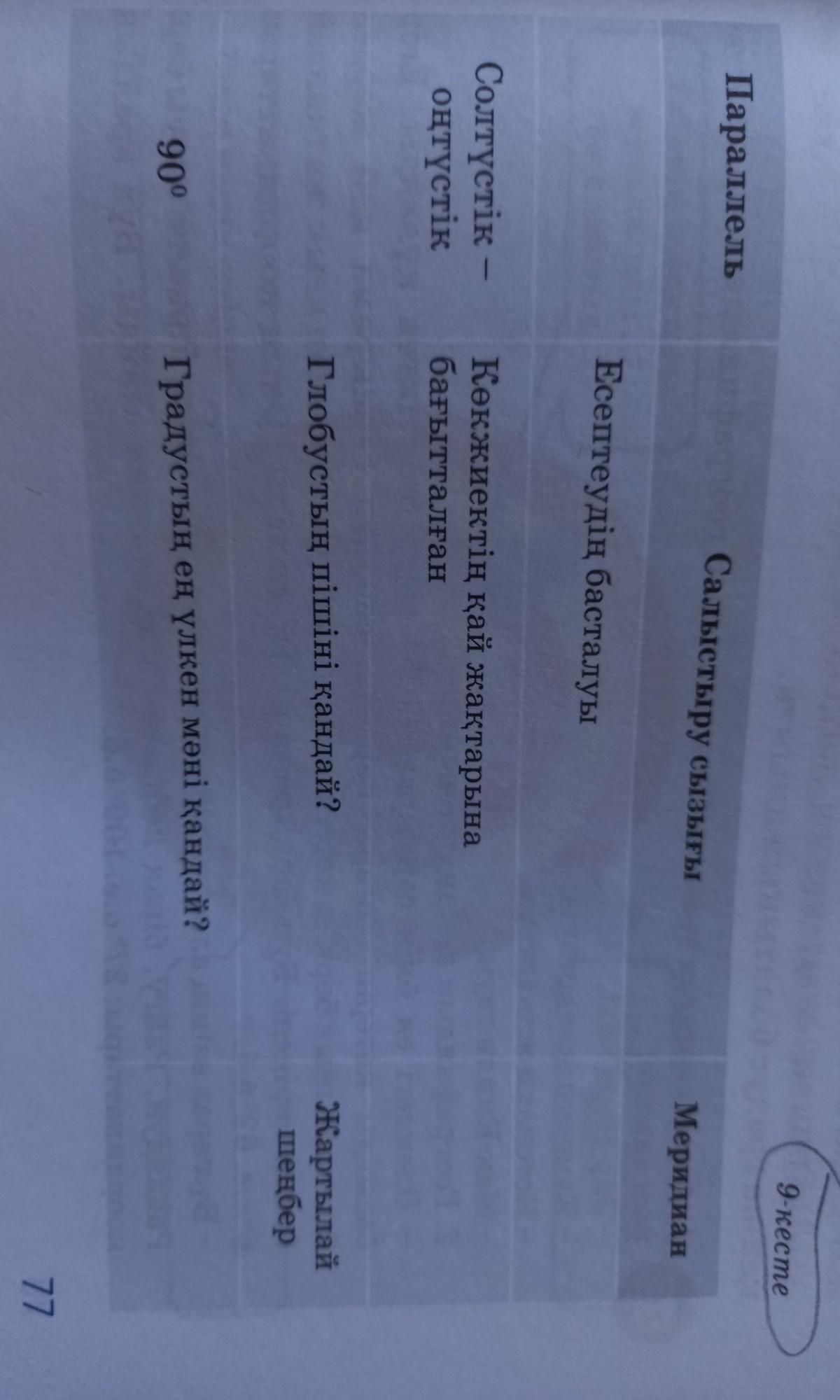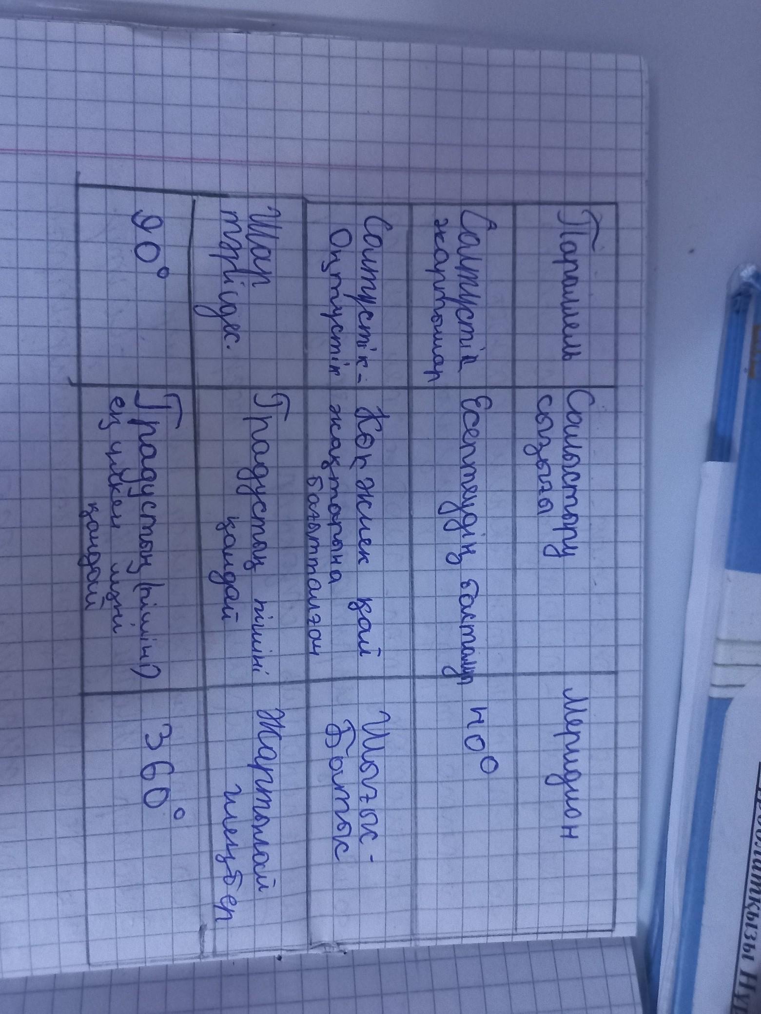 9 Kecme Параллель Салыстыру сызығы Меридиан Есептеудің басталуы Солтүстік- оңтүстік Көкжиектің қай жақтарына бағытталған Глобустың пішіні қандай? Жартылай шеңбер 90⁰ Градустың ең үлкен мәні қандай? 77