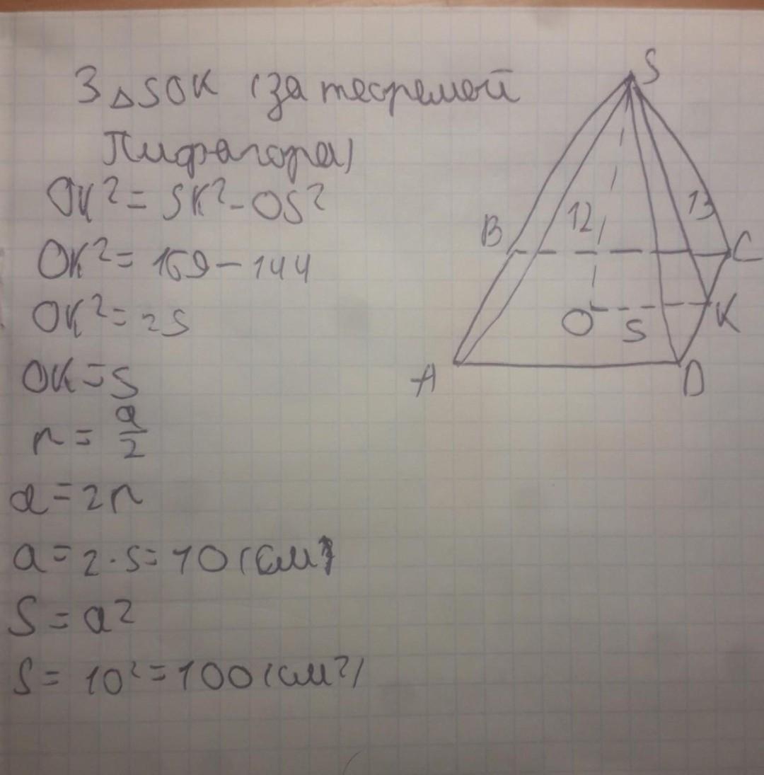 найдите площадь полной поверхности правильной четырехугольной пирамиды, в которой высота 12, а апофема 13 см