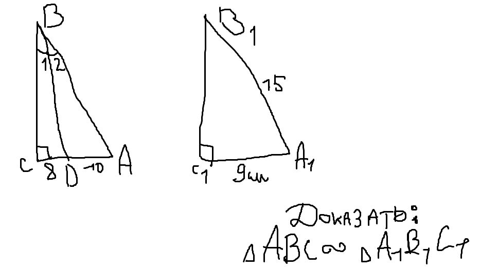 в другом треугольнике a1b1c1 сторона c1a1=9 см а сторона b1a1= 15 см угол c=c1=90 градусов нужно доказать подобие треугольников если что не понятно смотрите на рисунок.
