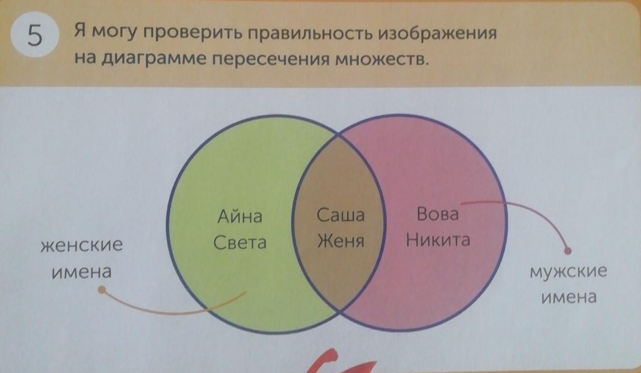 А = { Айна , Света , Саша , Женя } , B = { Вова , Никита , Женя , Саша} ;
