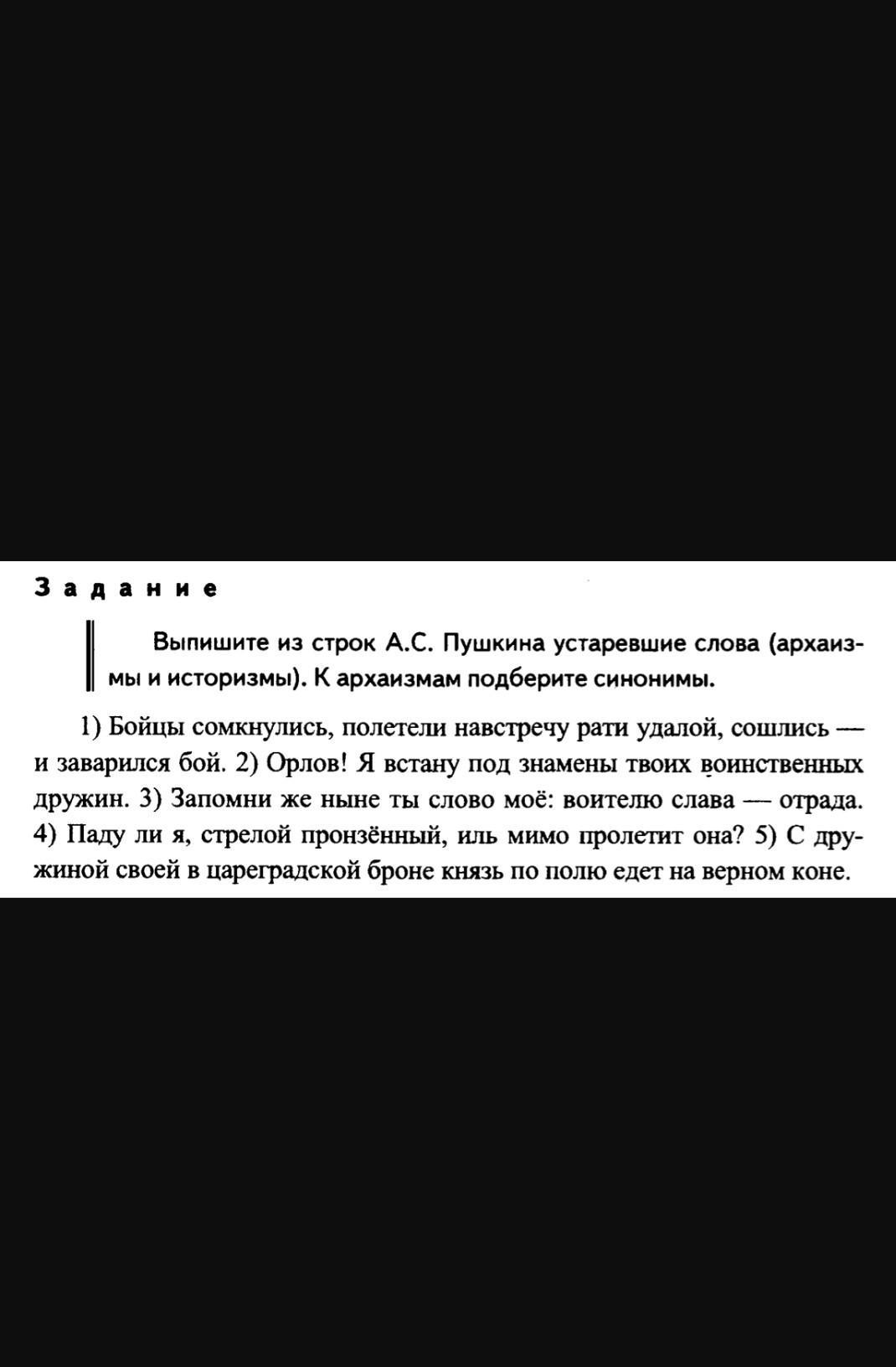 Выпишите из строк А.С Пушкина устаревшие слова(Архаизмы и историзмы)к архаизмам подберите синонимы