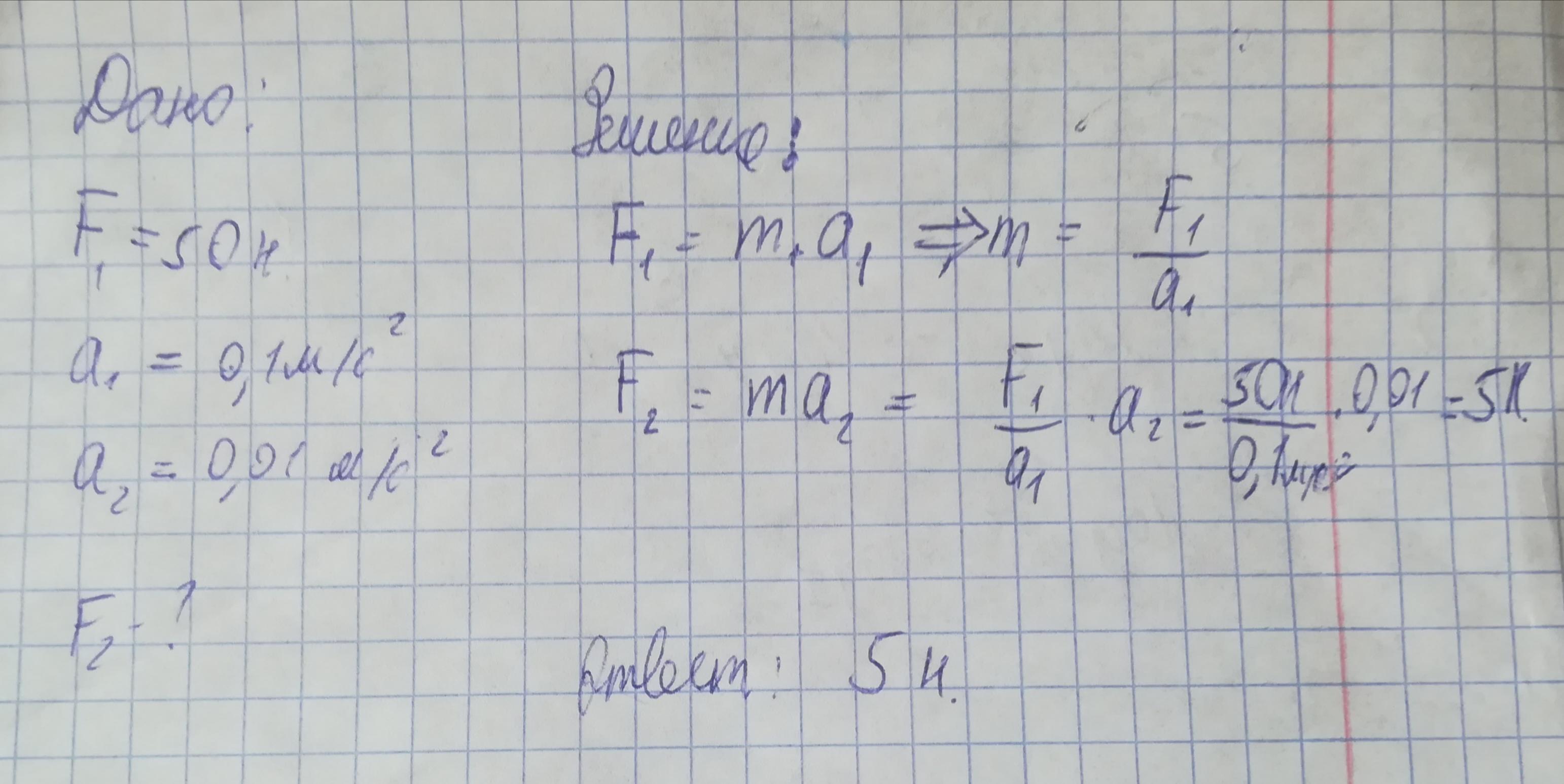 Сила 50 H сообщает телу ускорение 0,1 м/с^2. Какая сила сообщает этому телу ускорение 0,01 м/с^2. С дано и объяснением