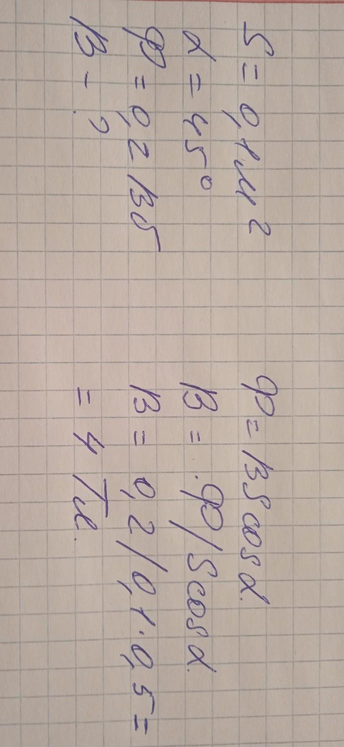 Линии индукции однородного магнитного поля пронизывают рамку площадью 0,1 м2 под углом 45° к её поверхности, создавая магнитный поток, равный 0,2 Вб. Чему равен модуль вектора индукции магнитного поля?