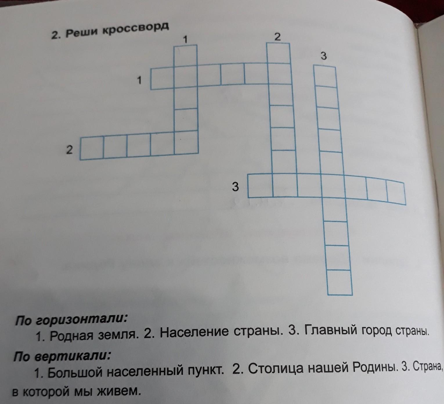 1.Большой населенный пункт.2. Столица нашей Родины.3.Страна,в которой мы живём.