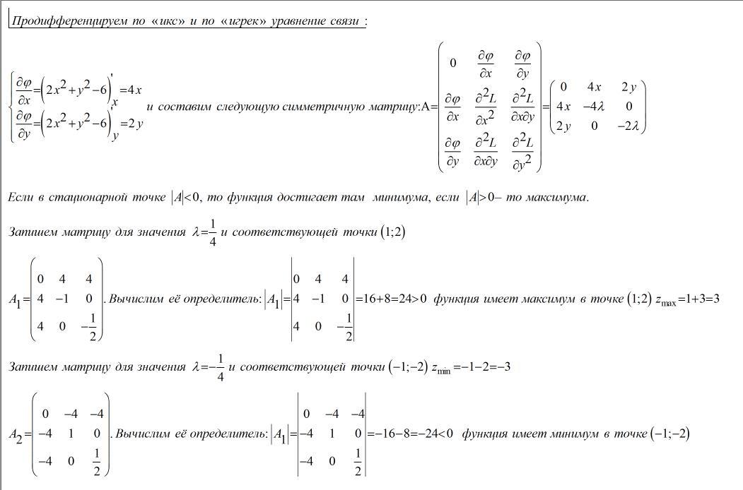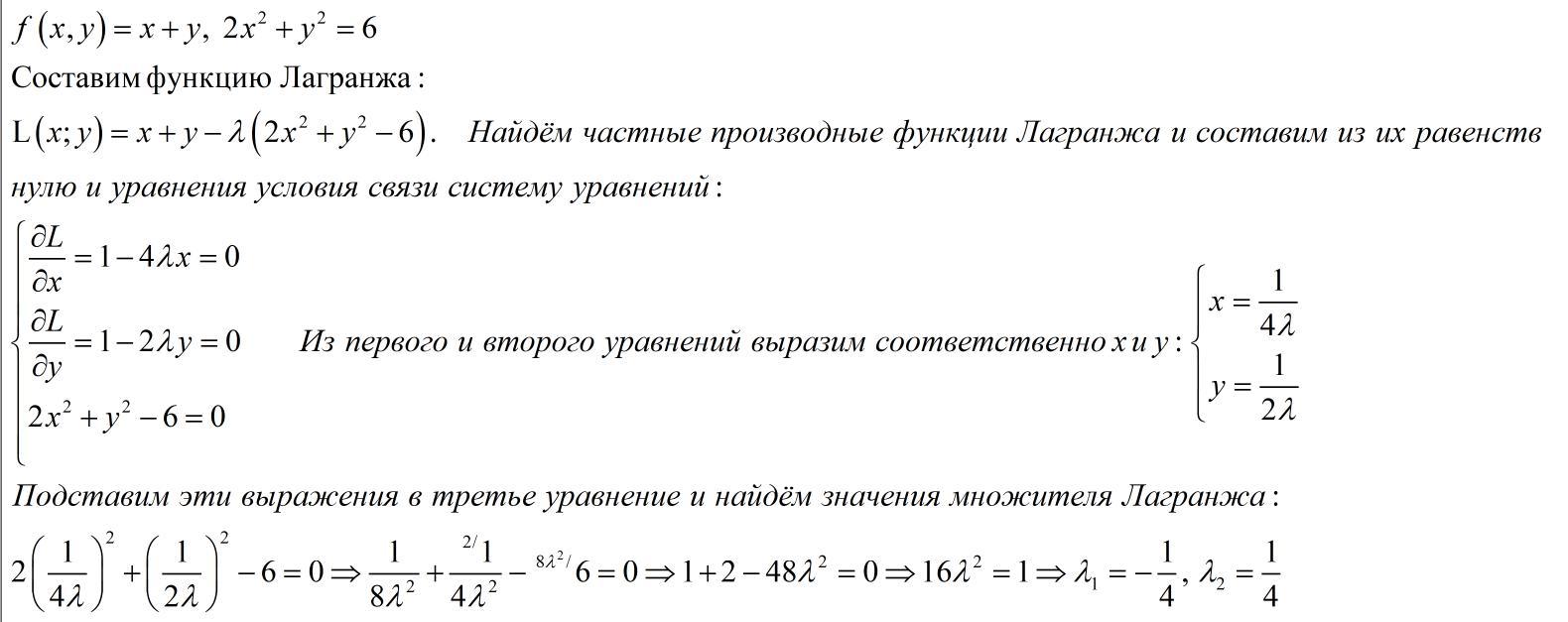 Помогите пожалуйста, задание по математике по теореме Лагранжа с матрицей! Задача: Исследовать на условный экстремум функцию f при данных условиях связи f(x,y)=x+y, 2x^2+y^2=6