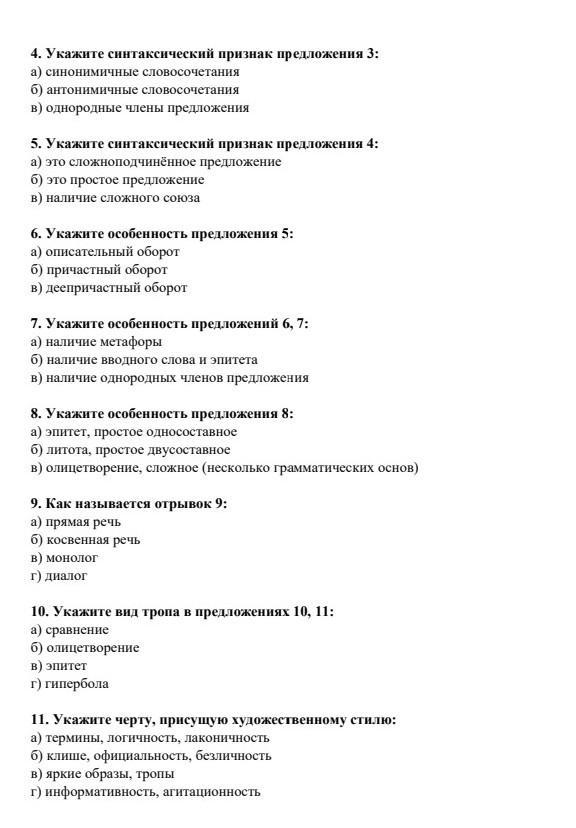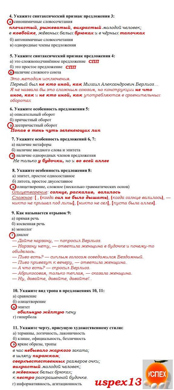 Внимательно прочитайте текст: (1) Однажды весною, в час небывало жаркого заката, в Москве, на Патриарших прудах, появились два гражданина. (2) Первый из них, одетый в летнюю серенькую пару. был маленького роста, упитан, лыс, свою приличную шляпу пирожком нёс в руке, а на хорошо выбритом лице его помещались сверхъестественных размеров очки в чёрной роговой оправе (3) Второй - плечистый, рыжеватый, вихрастый молодой человек в заломленной на затылок клетчатой кепке- был в ковбойке, жëваных белых брюках и в чёрных тапочках. (4) Первый был не кто иной, как Михаил Александрович Берлиоз, председатель правления одной из крупнейших московских литературных ассоциаций, сокращенно именуемой МАССОЛИТ, и редактор толстого художественного журнала, а молодой спутник его -поэт Иван Николаевич Понырёв, пишущий под псевдонимом Бездомный. (5) Попав в тень чуть зеленеющих лип, писатели первым долгом бросились к пестро раскрашенной будочке с надписью "Пиво и воль" (6) Да, следует отметить первую странность этого страшного майского вечера. (7) но и во всей аллее, параллельной Малой Бронной улице, не олько у будочки, но Не оказалось ни одного человека. В тот час, когда уж, кажется, и сил не было дышать, когда солнце, раскалив Москву. сухом тумане валилось куда-то за Садовое кольцо, никто не пришёл под липы, никто не сел скамейку, пуста была аллея. (9) - Дайте нарзану, сил Берлио попросил Нарзану нету, - ответила женщина в будочке и почему-то обиделась. -Пиво есть?-сиплым голосом осведомился Бездомный. Пиво привезут вечеру, - ответила женщина. А что есть? - спросил Берлиоз. cupacial de pa - Абрикосовая, только тёплая, - Ну, давайте, давайте, давайте!.. сказала женщина. (10) Абрикосовая дала обильную жёлтую пену, и в воздухе запахло парикмахерской. (11) Напившись, литераторы немедленно начали икать, расплатились и уселись на скамейке лицом к пруду и спиной к Бронной».