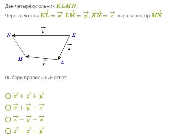 Через векторы KL−→−=x→, LM−→−=y→, KN−→−=z→ вырази вектор MN−→−.