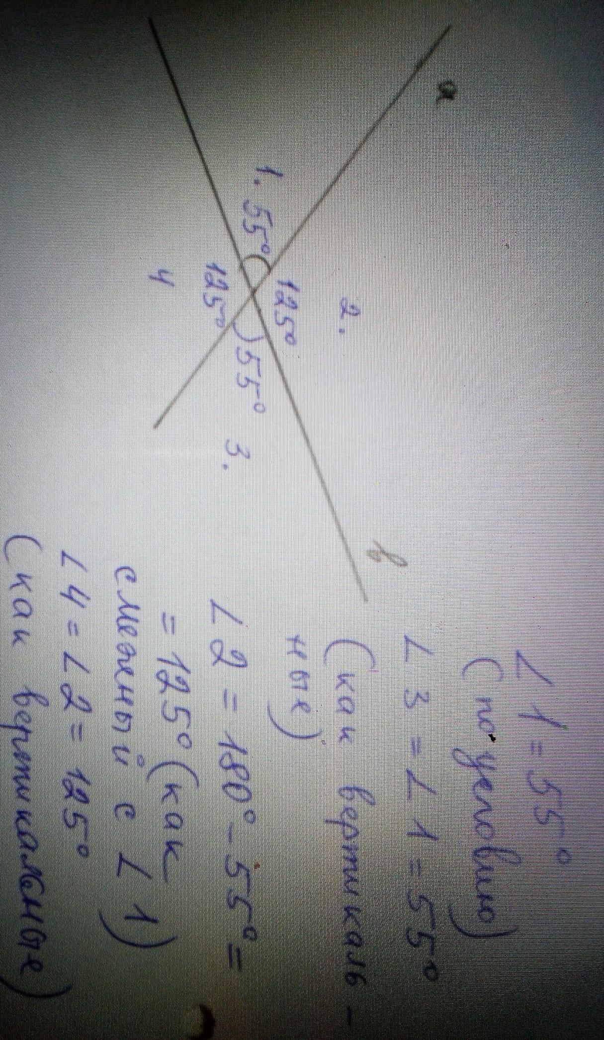 при пересечении этих прямых образовались четыре смешанных угла и в сумме они 360 градусов если один из них равен 55 то его вертикальный тоже равен 55 то есть два угла по 55 градусов чтобы найти два других нужно 55 + 55 = 100, 360 - 110 = 250 и 250 поделить на 2 равно 125 т.е, два этих угла по 125 градусов