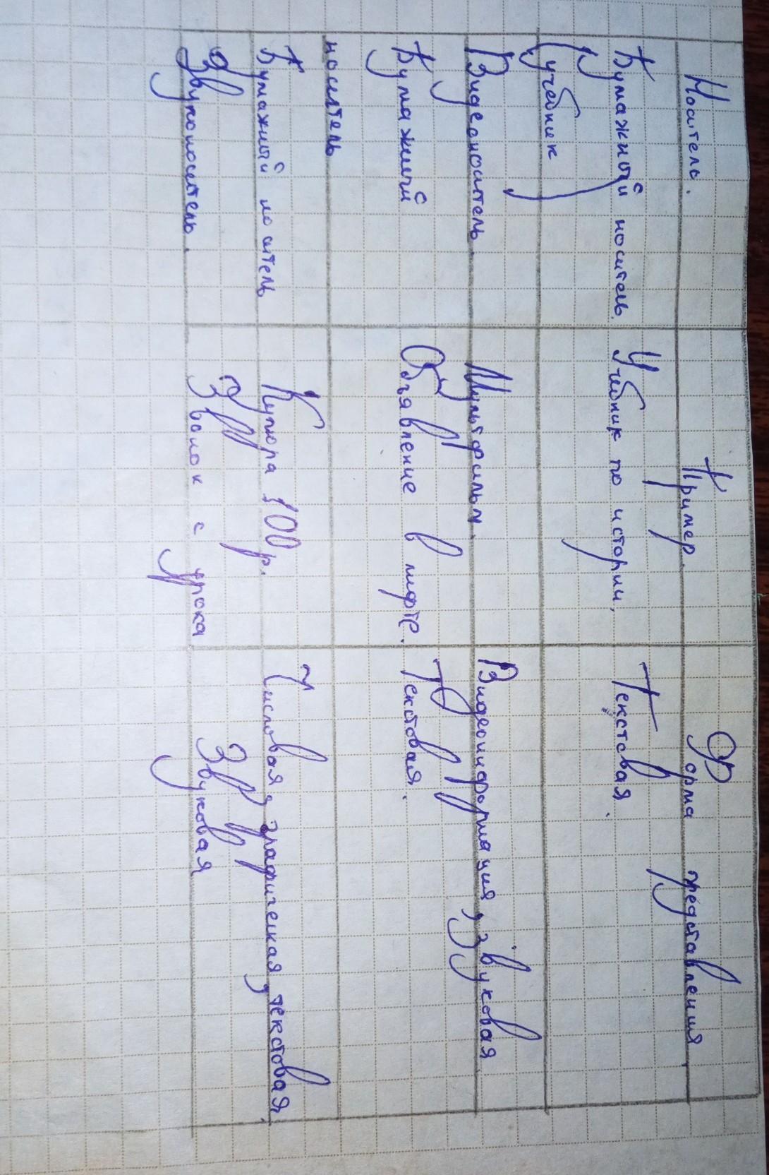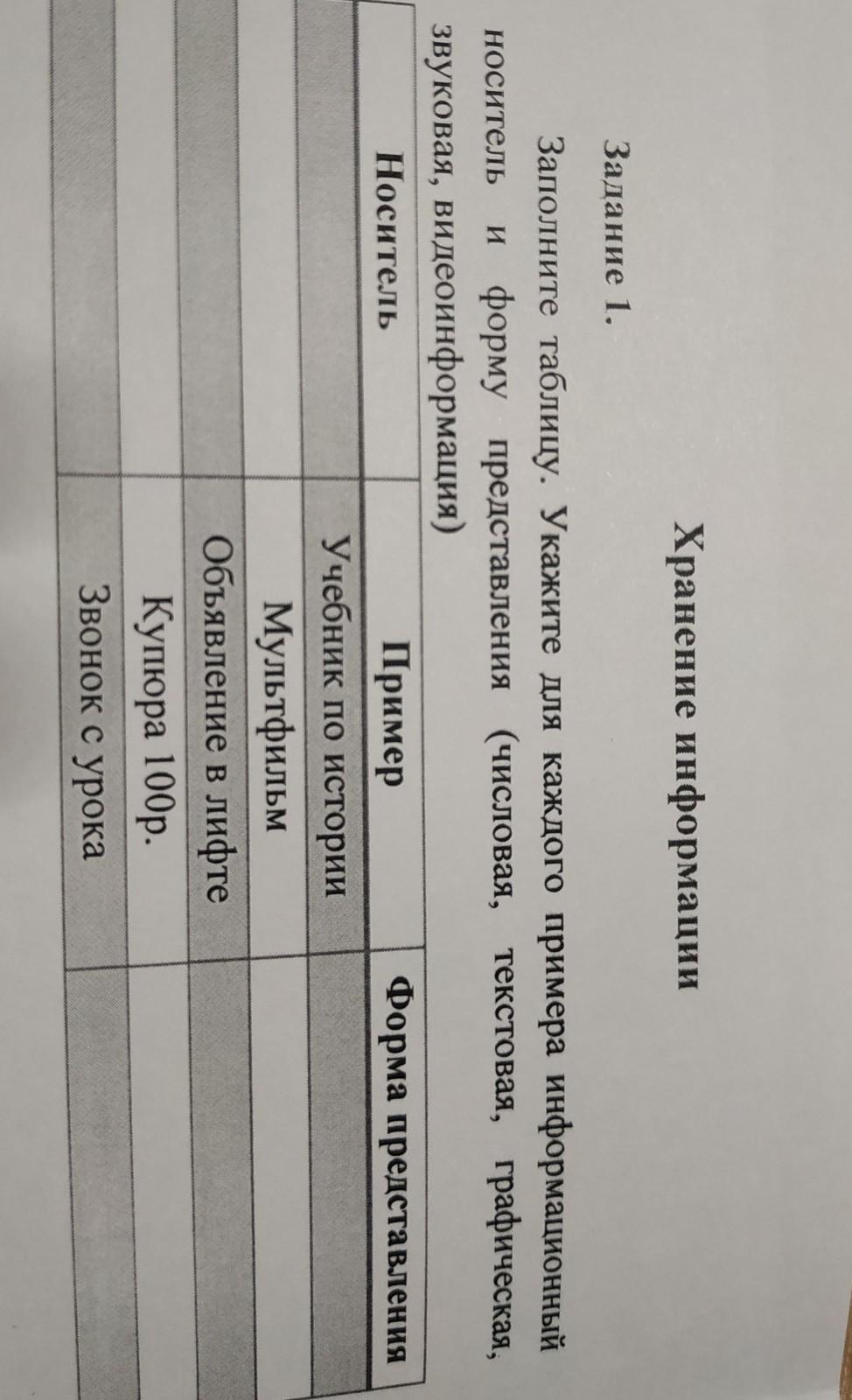 Хранение информации Задание 1. носитель Заполните таблицу. Укажите для каждого примера информационный и форму представления (числовая, текстовая, графическая, звуковая, видеоинформация) Носитель Пример Форма представления Учебник по истории Мультфильм Объявление в лифте Купюра 100р. Звонок с урока