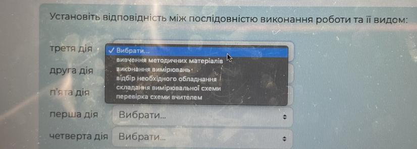 Усrановіть відповідність між послідовністю виконання роботи та її видом: