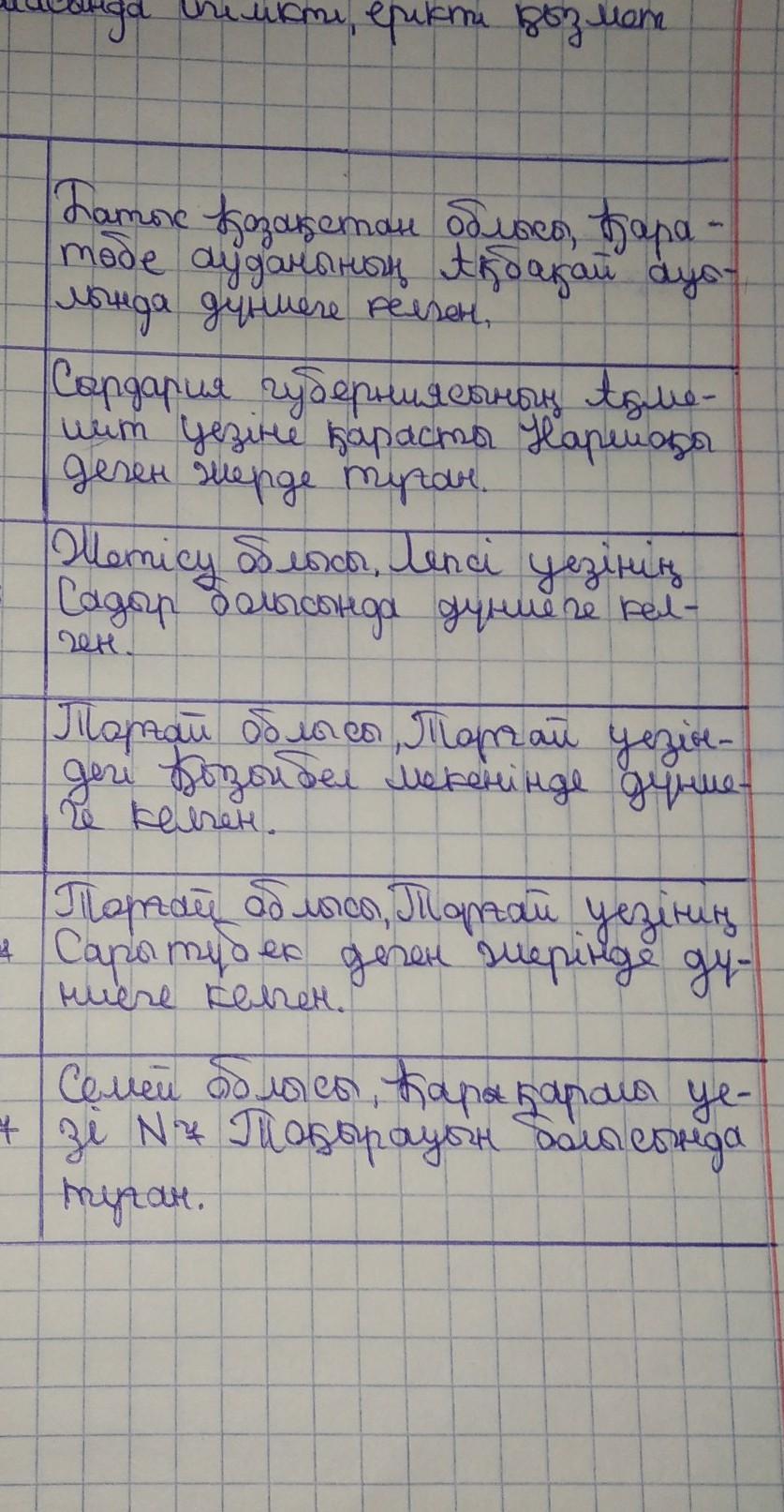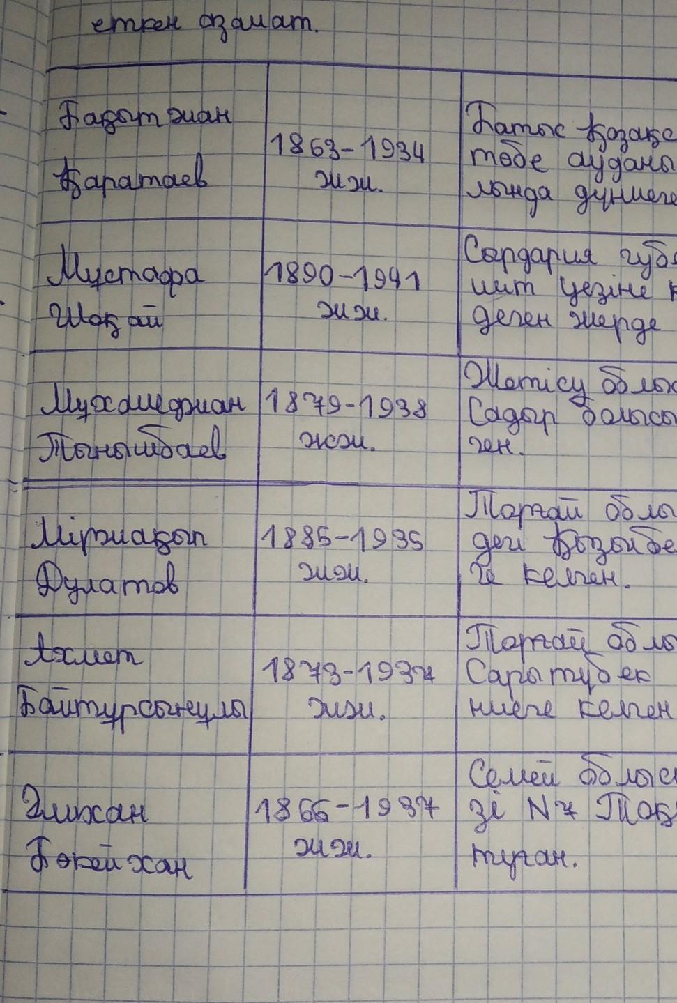 кестені дәптерлеріңе сызып,бос ұяшықтарға тұлға есімдері олардың өмір сүрген уакытары мен өмірбаяндары толтырып жазыңдар
