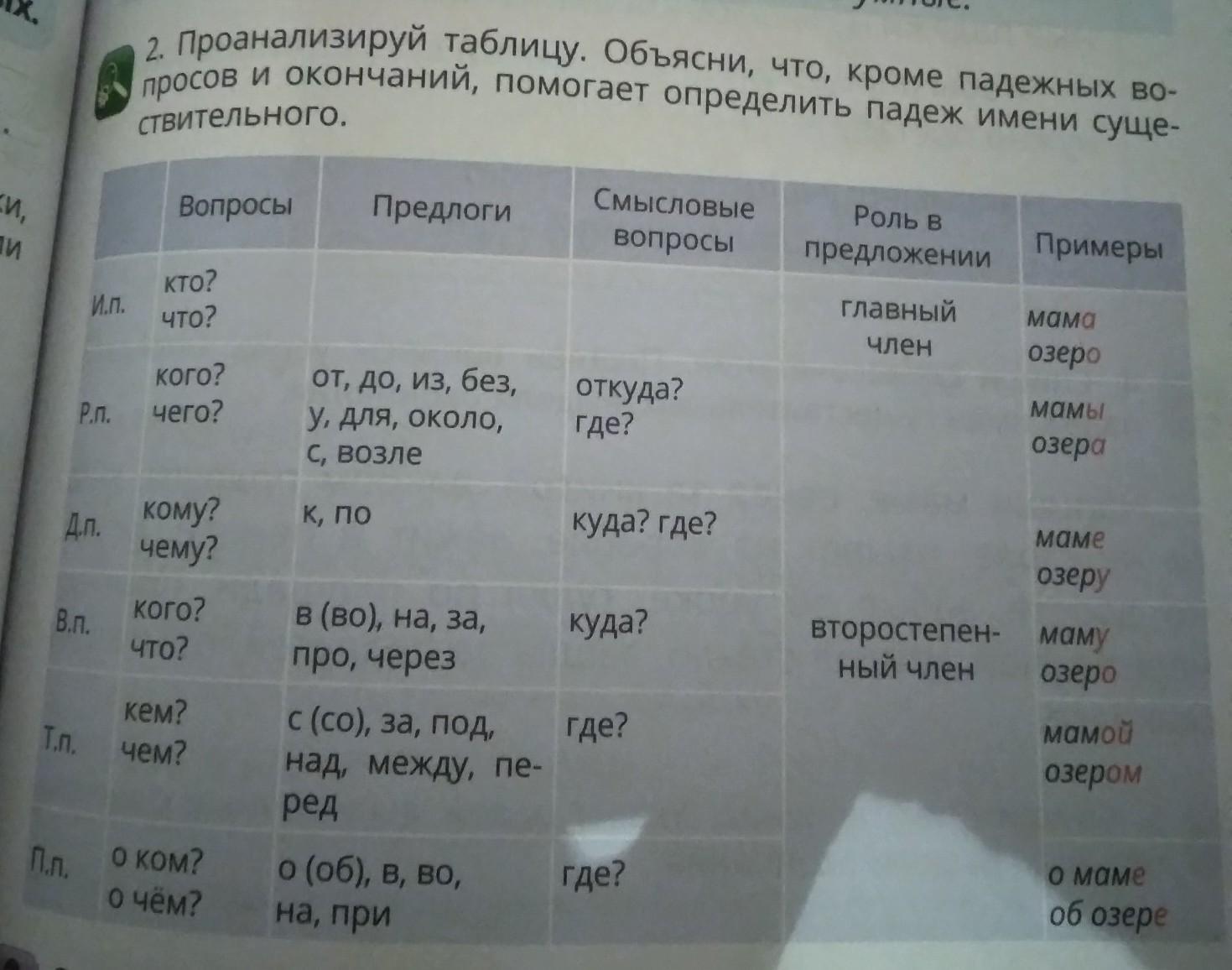 Проанализируйте таблицу. Объясни, что, кроме падежных вопросов и окончаний, помогает определить падеж имени существительного
