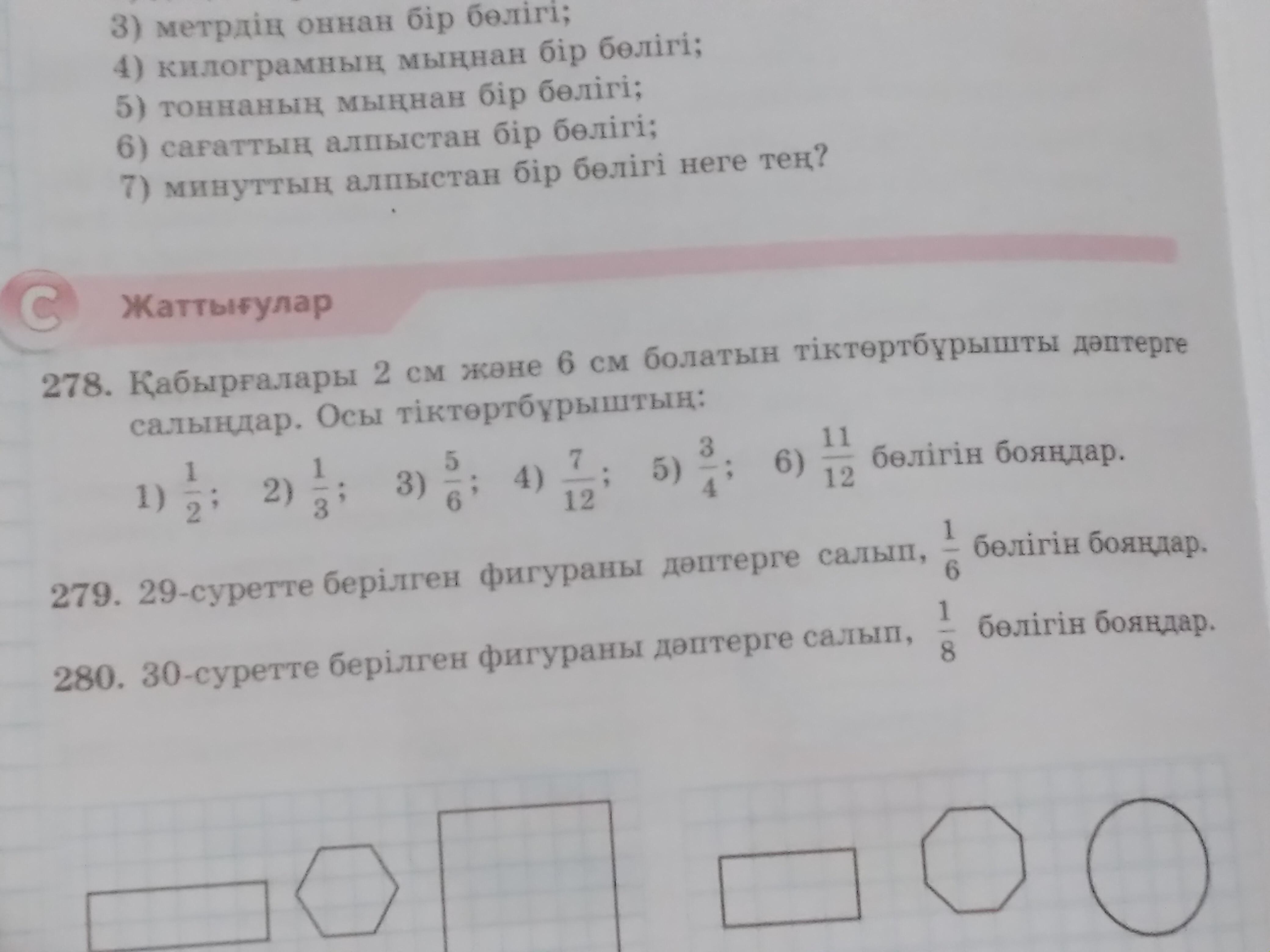 Положите в тетрадь прямоугольной формы со сторонами 2 см и 6 см. Из этого прямоугольника: 1) 1/2; 2) 1/3; 3) 5/6; 4) 7/12 5) 3/4; 6) Покрасьте часть 11/12 упражнение 278