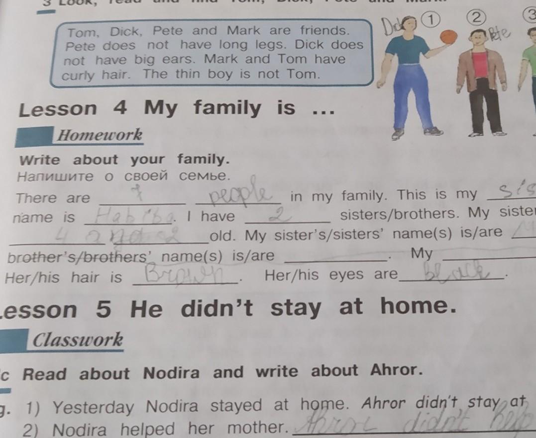In my family is 7 people.It's my mom,dad,and 2 sisters,they are 2 and 4 years old.My first sisters name Habiba and my second sisters name is ...Their hair is brown.They eyes is black.