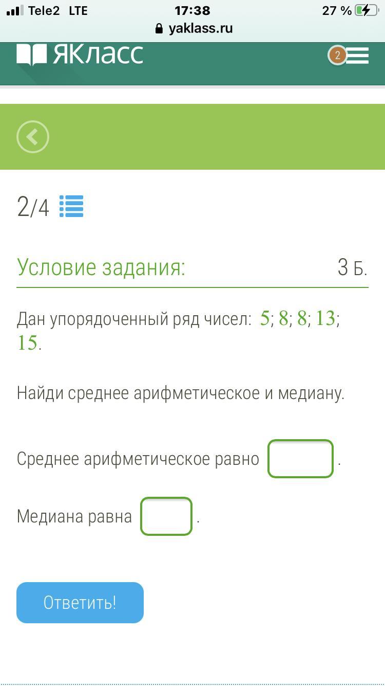 Среднее арифметическое a=(5+8+8+13)/4=34/4=17/2=8,5. Медиана m=(8+8)/2=8.
