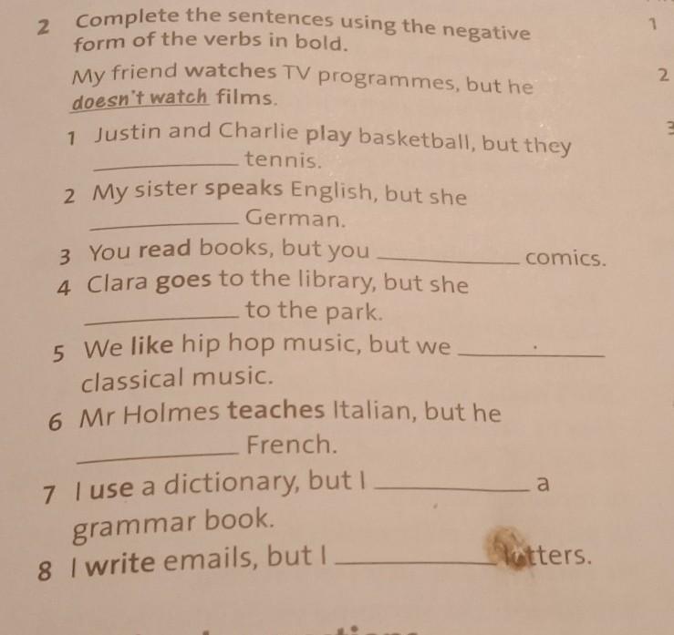 1 complete the sentences using the negative form of the verbs in bold. My friend watches TV programmes, but he doesn't watch films 1 Justin and Charlie play basketball, but they tennis 2 My sister speaks English, but she German 3 You read books, but you comics 4 Clara goes to the library, but she to the park, 5 We like hip hop music, but we classical music 6 Mr Holmes teaches Italian, but he French 7 I use a dictionary, but a grammar book. 8 I write emails, but! Otters.