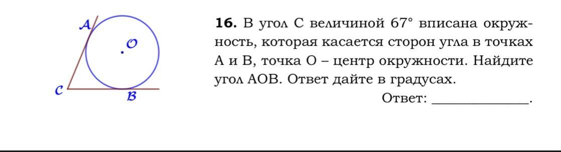 2) ∠AOB = 360 - ∠C - ∠CAO - ∠CBO = 360 - 67 - 90 - 90 = 113 градусов.