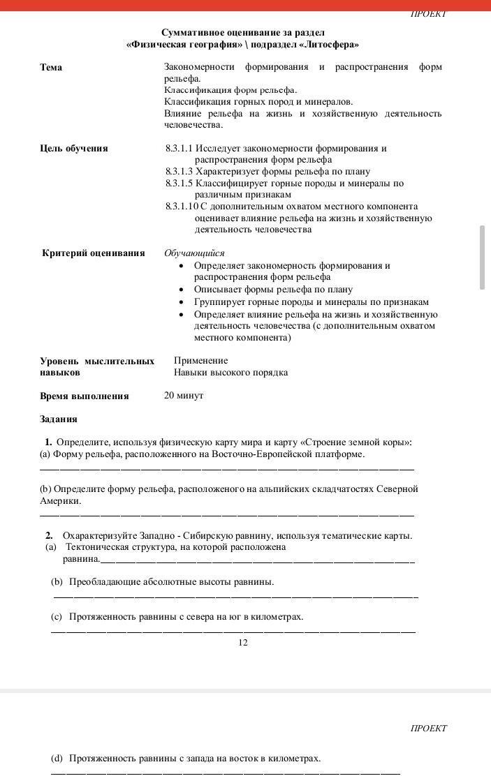 Задания 1. Определите, используя физическую карту мира и карту «Строение земной коры»: (а) Форму рельефа, расположенного на Восточно-Европейской платформе. __________________________________________________________________________ (b) Определите форму рельефа, расположеного на альпийских складчатостях Северной Америки. __________________________________________________________________________ 2. Охарактеризуйте Западно - Сибирскую равнину, используя тематические карты. (a) Тектоническая структура, на которой расположена равнина.______________________________________________________________ (b) Преобладающие абсолютные высоты равнины. ________________________________________________________________________ (c) Протяженность равнины с севера на юг в километрах. _________________________d) Протяженность равнины с запада на восток в километрах. ___________________________________________________________