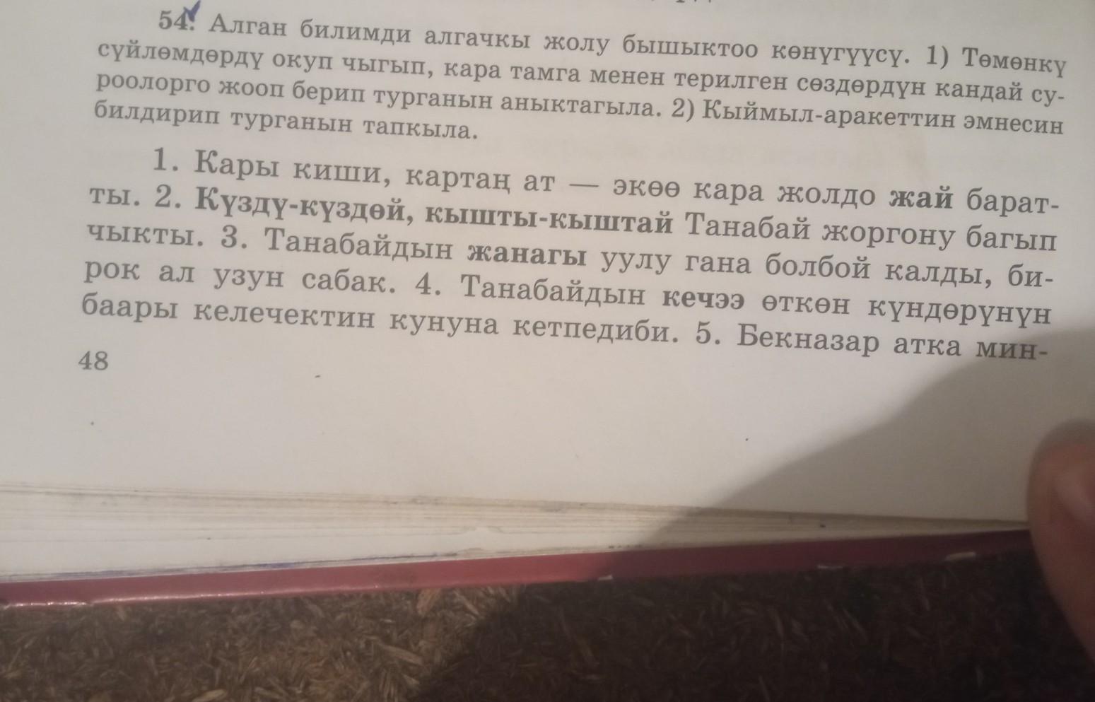 Кандай? Жай. Эмнени ? Күздү- күздөй, кышты-кыштай. Кайсы? Жанагы . Качан? Кечээ.