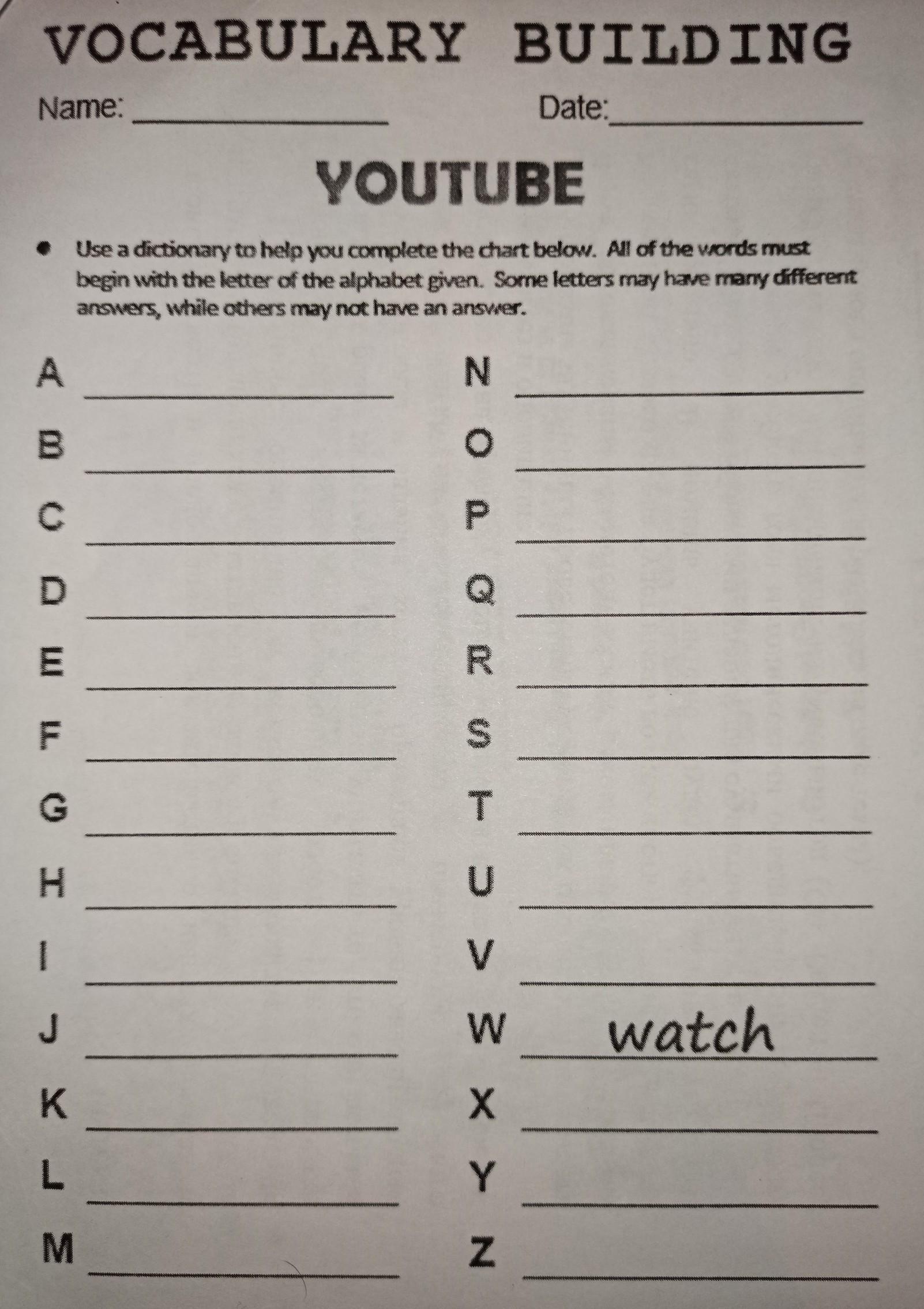 • Use a dictionary to help you complete the chart below. All of the words must begin with the letter of the alphabet given. Some letters may have many different answers, while others may not have an answer.