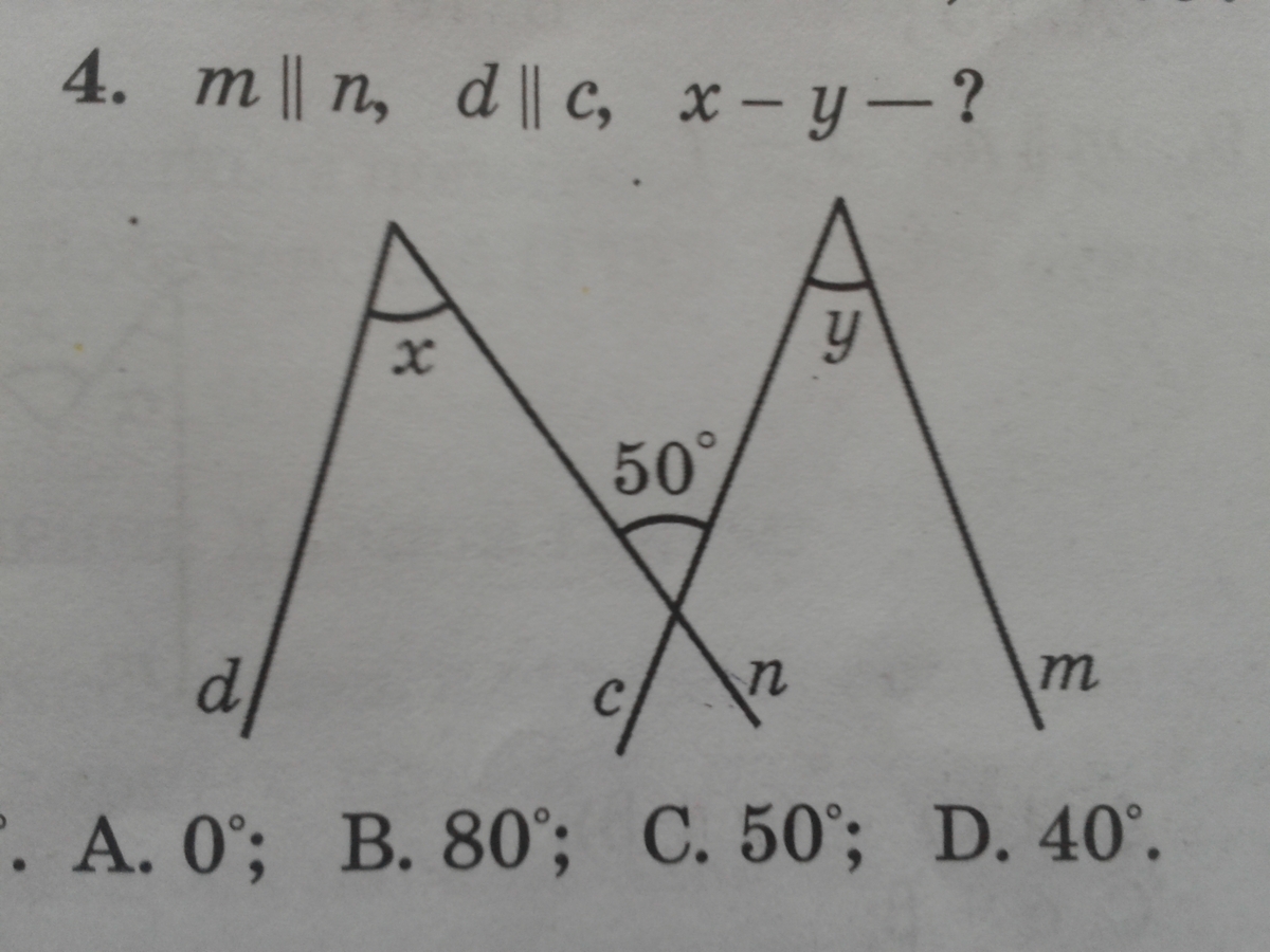 Так как m||n, если мы рассмотрим c как секущую, то ∠y и ∠cn=50° - внутренние накрест лежащие и, следовательно, равны. Далее, c||d и n - секущая, тогда дополнительный к ∠cn будет 130°, и также он будет дополнительным к ∠x, тогда получаем, что ∠y=∠x=50° Ответ С.