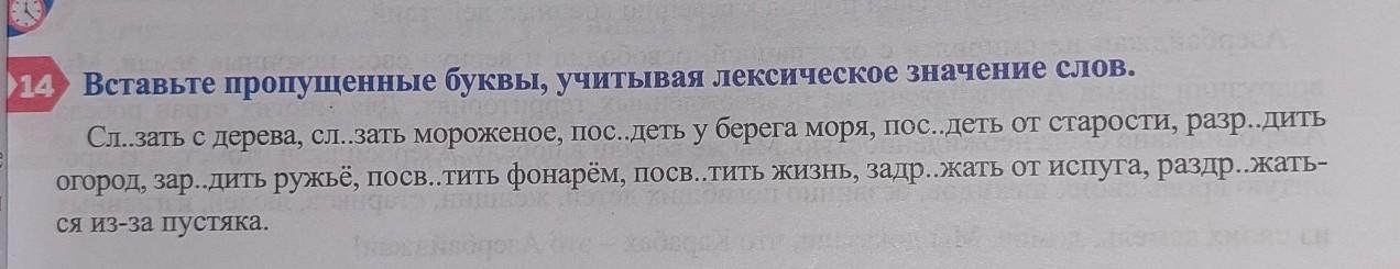сенние рудами 14 Вставьте пропущенные буквы, учитывая лексическое значение слов. Сл..зать с дерева, сл..зать мороженое, пос..деть у берега моря, пос..деть от старости, разр...дить огород, зар..дить ружьё, посв.тить фонарём, посв.тить жизнь, задр..жать от испуга, раздр..жать- ся из-за пустяка. алЫМИ,