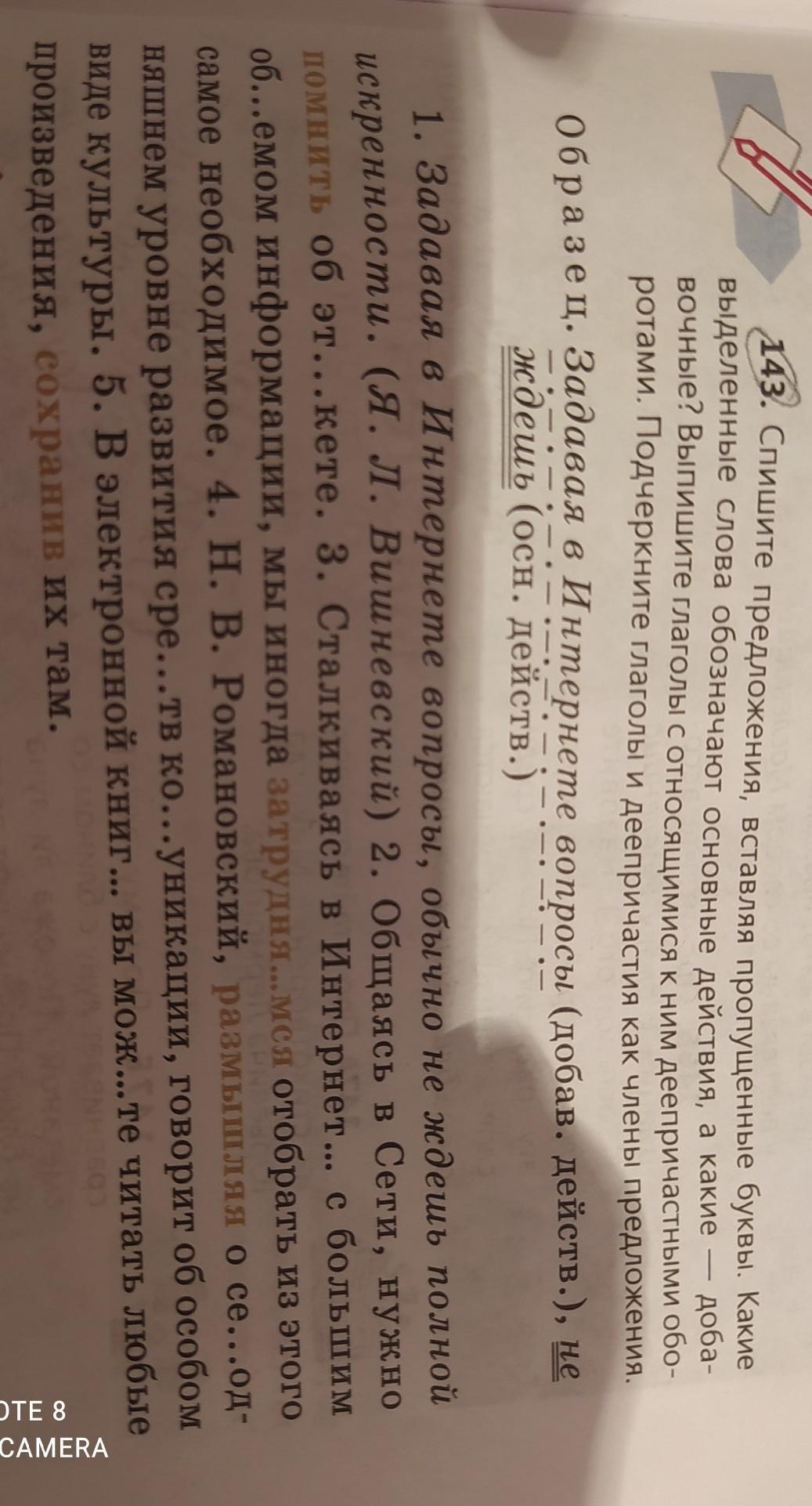 143. Спишите предложения, вставляя пропущенные буквы. Какие выделенные слова обозначают основные действия, а какие — доба- вочные? Выпишите глаголы с относящимися к ним деепричастными обо- ротами. Подчеркните глаголы и деепричастия как члены предложения. Образец. Задавая в Интернете вопросы (добав. действ.), не ждешь (осн. действ.) .