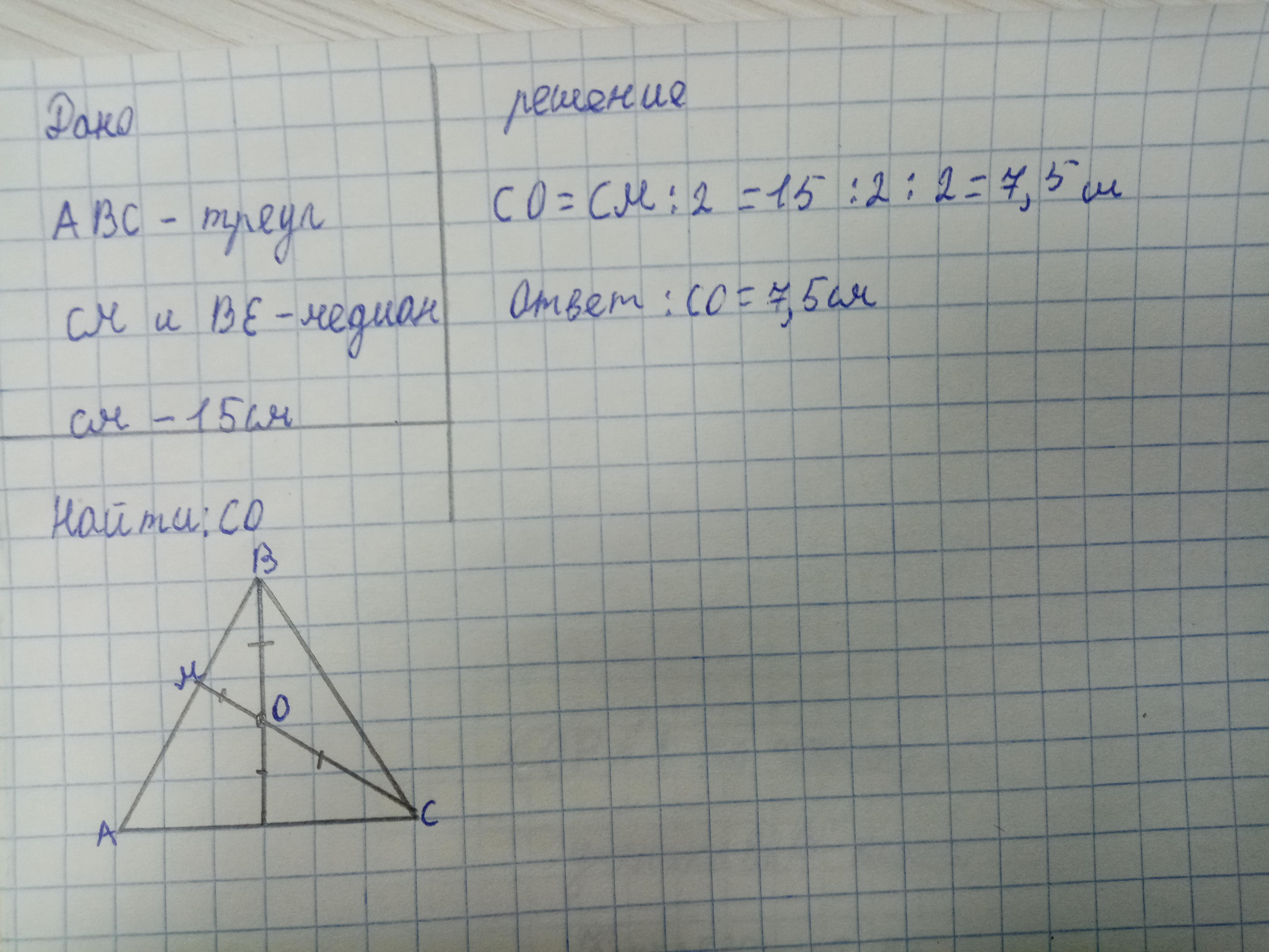 в треугольнике abc проведены медианы cm и be которые пересекаются в точке o. Найдите длину отрезка co, если cm=15 см
