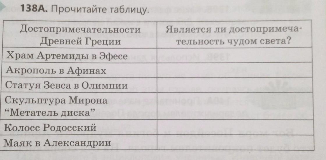 Прочитайте таблицу. Является ли достопримеча- тельность чудом света? Достопримечательности Древней Греции Храм Артемиды в Эфесе Акрополь в Афинах Статуя Зевса в Олимпии Скульптура Мирона “Метатель диска” Колосс Родосский Маяк в Александрии
