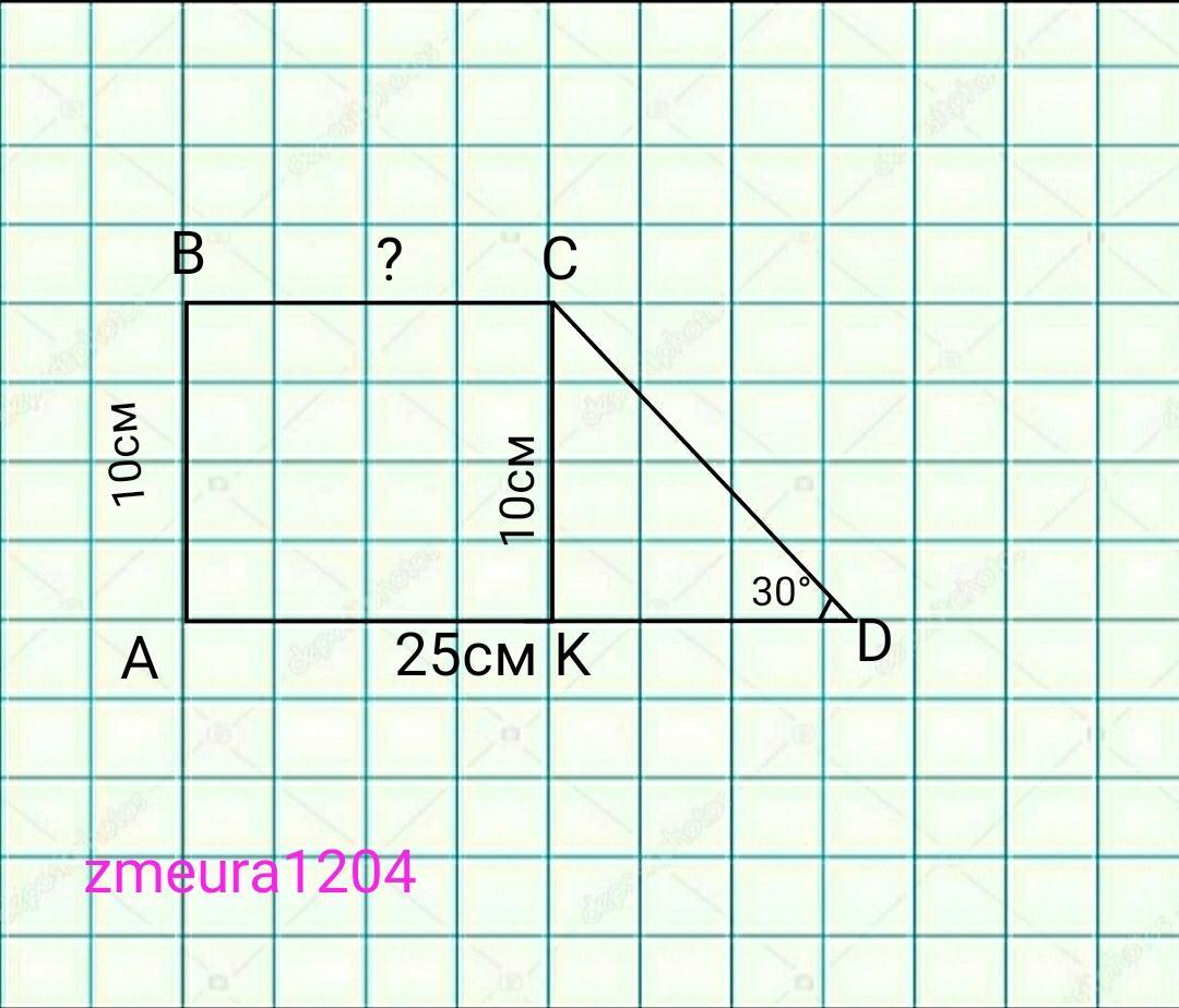 В прямоугольной трапеции острый угол равен 30 градусов. Меньшая боковая сторона равна 10 см, а большее основание равно 25 см. Вычисли длину меньшего основания. ПАМАГИТЕ