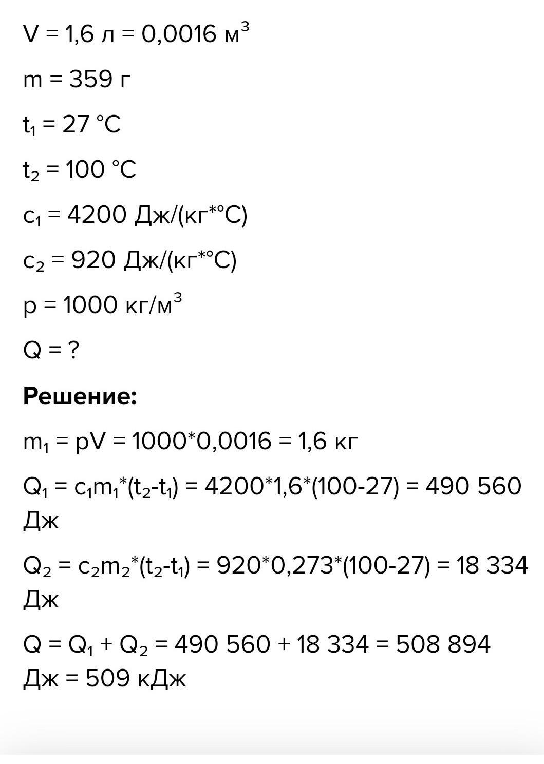 ДАЮ 20 БАЛОВ!!!Срочно помогите пожалуйста!!!Определи, какое количество теплоты получили алюминиевая кастрюля массой 314 г и находящаяся в ней вода объёмом 1,9 л при нагревании от 26°C до кипения при температуре 100°C. Удельная теплоёмкость алюминия равна 920 Дж/(кг·°C), удельная теплоёмкость воды — 4200 Дж/(кг·°C), плотность воды — 1000 кг/м³.