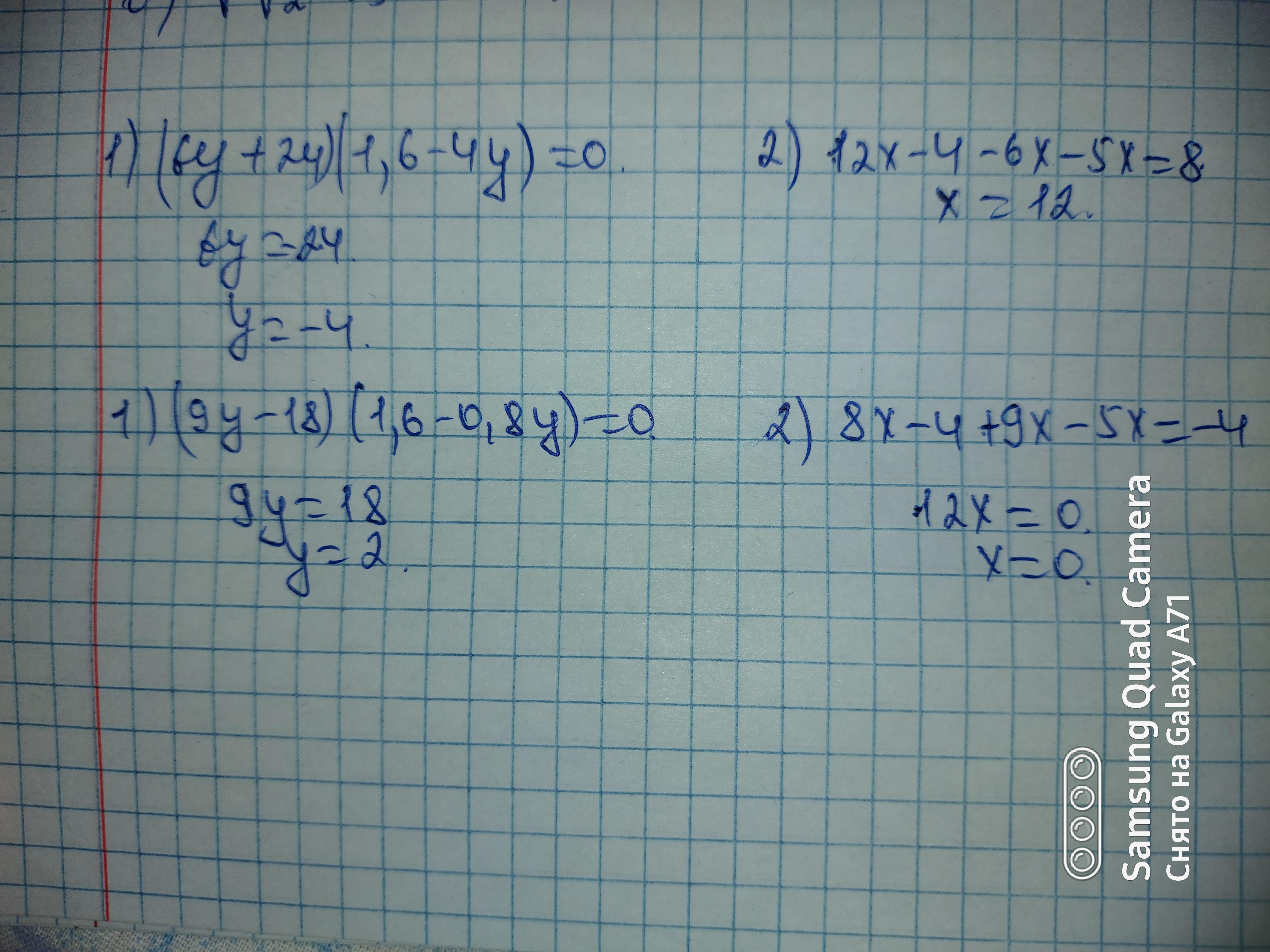 3. Решите уравнение: 1) (6у + 24)(1,6-4у) = 0; 2) 4(3х- 1) - 6х =5х+ 8. 1) (9у - 18)(1,6-0,8у) = 0; 2) 4(2х- 1) +9х =5х- 4.