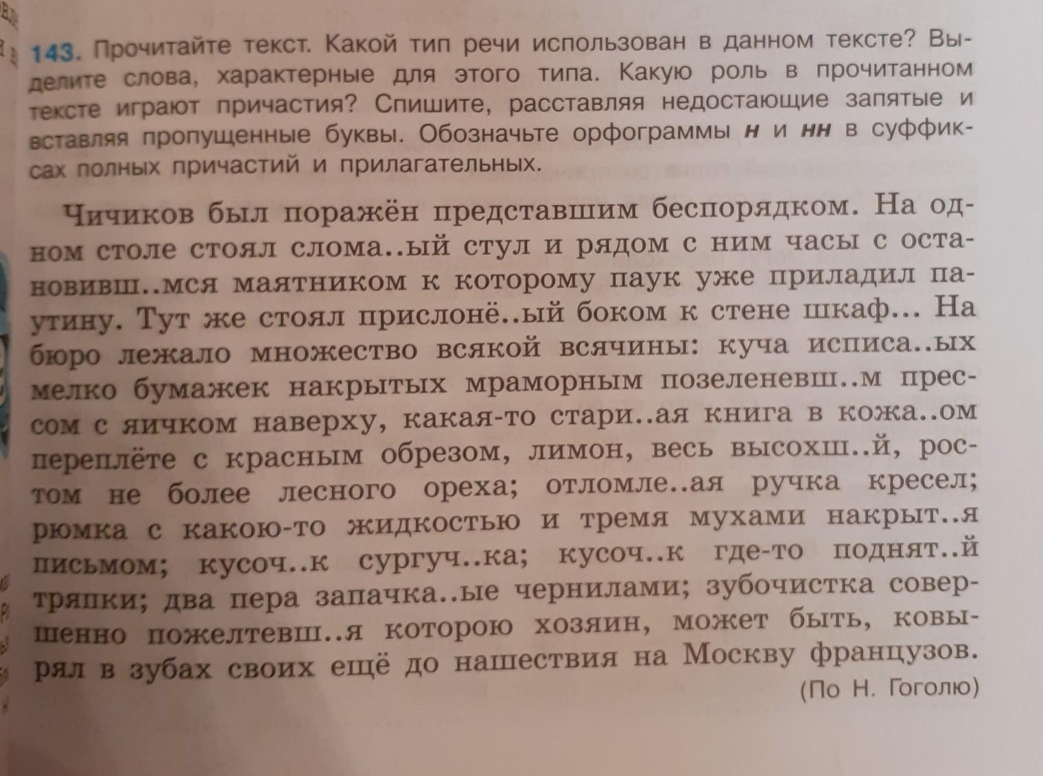 143. Прочитайте текст. Какой тип речи использован в данном тексте? Вы- делите слова, характерные для этого типа. Какую роль в прочитанном тексте играют причастия? Спишите, расставляя недостающие запятые и вставляя пропущенные буквы. Обозначьте орфограммы ни нн в суффик- сах полных причастий и прилагательных. Чичиков был поражён представшим беспорядком. На од- ном столе стоял слома..ый стул и рядом с ним часы с оста- новивш..мся маятником к которому паук уже приладил па- утину. Тут же стоял прислонё..ый боком к стене шкаф... На бюро лежало множество всякой всячины: куча исписа..ых мелко бумажек накрытых мраморным позеленевш..м прес- сом с яичком наверху, какая-то стари..ая книга в кожа..ом переплёте с красным обрезом, лимон, весь высохш..й, рос- TOM не более лесного ореха; отломле..ая ручка кресел; рюмка с какою-то жидкостью и тремя мухами накрыт..я письмом; кусоч..к сургуч..ка; кусоч..к где-то поднят..й 3 тряпки; два пера запачка..ые чернилами; зубочистка совер- шенно пожелтевш..я которою хозяин, может быть, ковы- рял в зубах своих ещё до нашествия на Москву французов. (По Н. Гоголю)