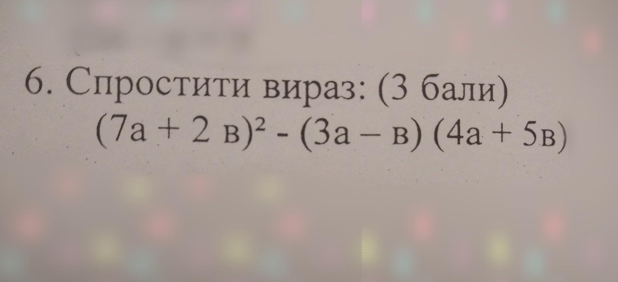 (7а+2в)² - (3а-в)(4а+5в) = 49а² + 28ав + 4в² - (12а² - 4ав+ 15ав - 5в²) = 49а² + 28ав + 4в² - 12а² + 4ав - 15ав + 5в² = 37а² + 9в² + 19ав но я не уверен так как давно такие примеры не решала