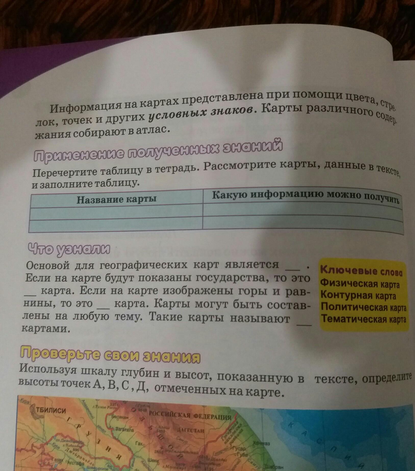 Перечертите таблицу в тетрадь. Рассмотрите карты, данные в тексте, и заполните таблицу. Название карты Какую информацию можно получить