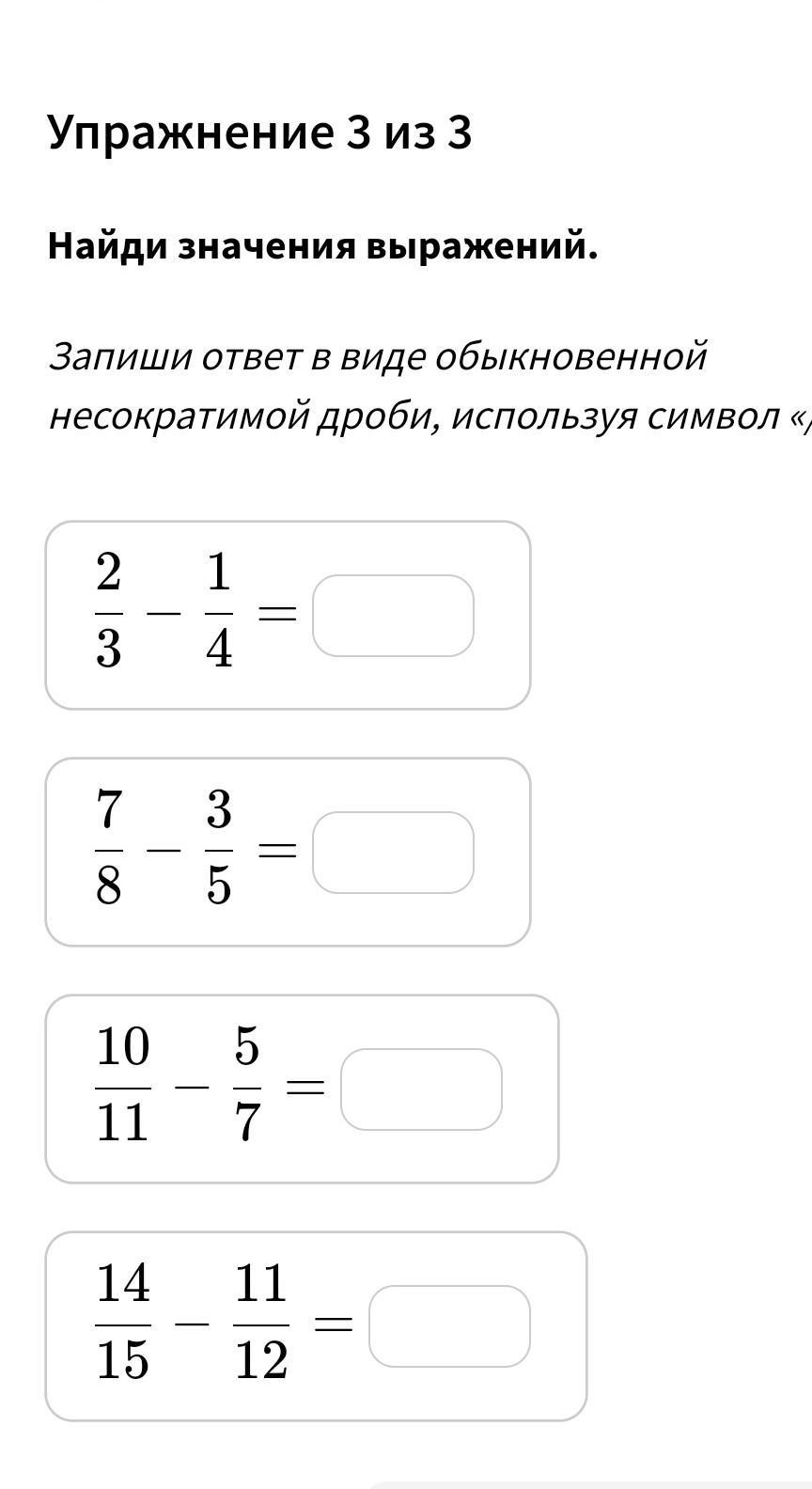 2/3 - 1/4 = 5/12 - приводим к общему знаменателю