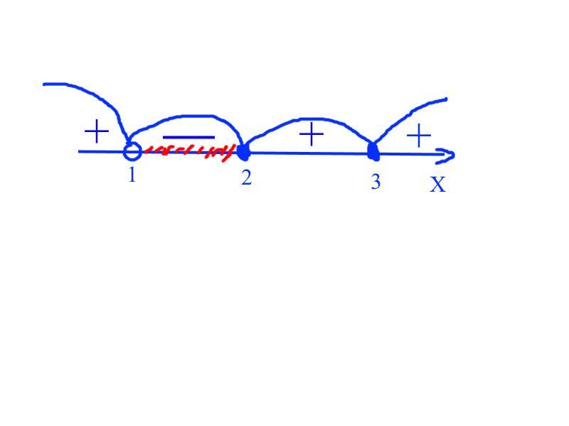 изобразим точки на координатной прямой. Точка "1" будет выколота, так как она обнулит знаменатель, а на 0 делить нельзя. Точки "2" и "3" будут закрашенными, т.к знак неравенства "меньше или равно" (см рис)