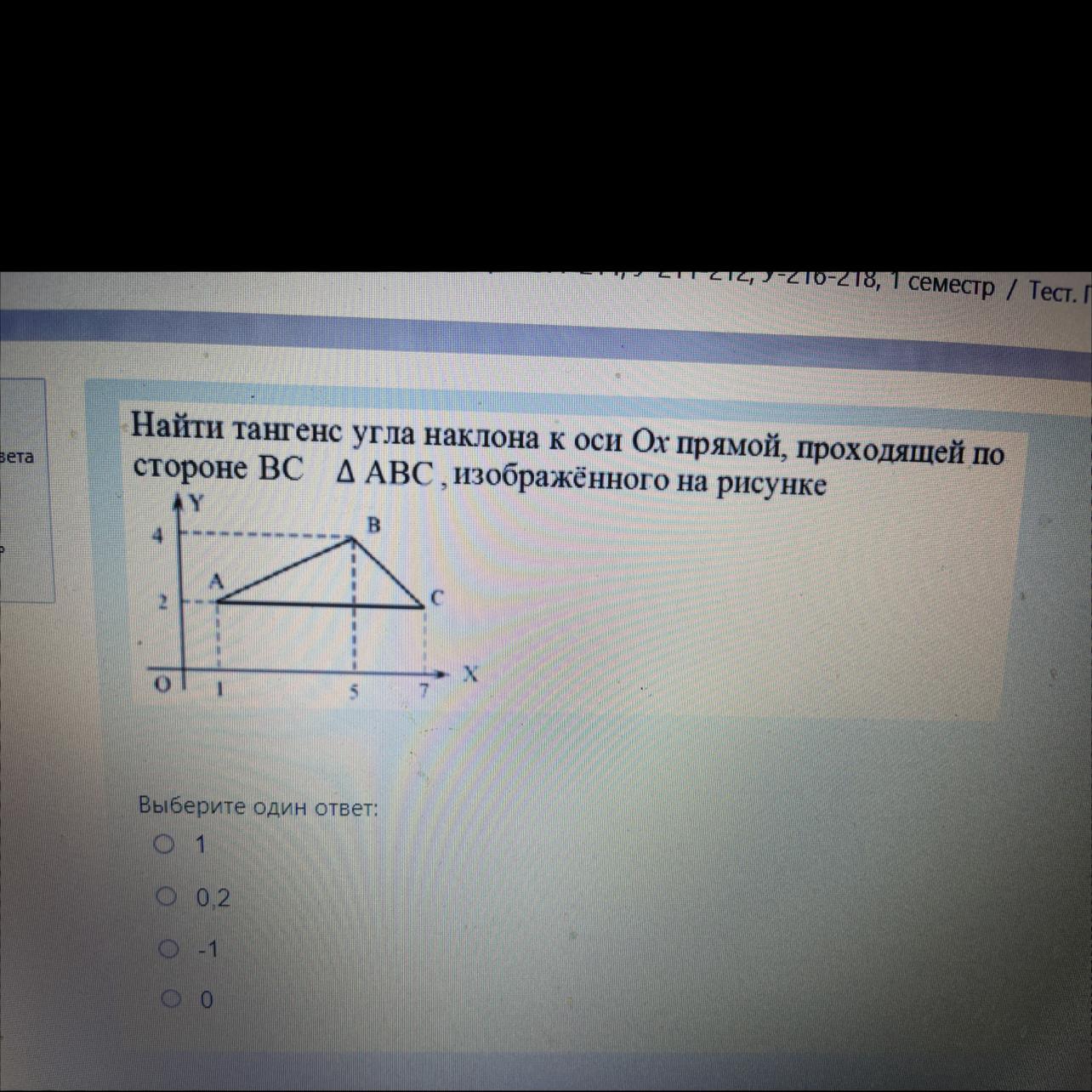 найти тангенс угла наклона к оси Ох прямой, подходящей по стороне ВС треугольника АВС . изображенного на рисунке