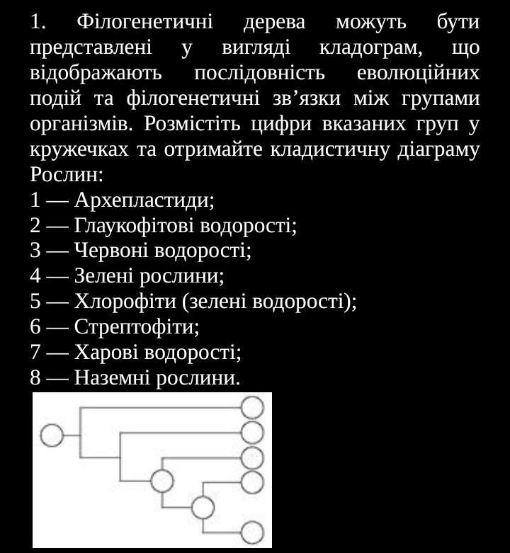 Тема 4. 1. Філогенетичні дерева можуть бути представлені у вигляді кладограм, що відображають послідовність еволюційних подій та філогенетичні зв'язки між групами організмів. Розмістіть цифри вказаних груп у кружечках та отримайте кладистичну діаграму Рослин: 1 — Архепластиди; 2 — Глаукофітові водорості; 3 — Червоні водорості; 4 Зелені рослини, 5 — Хлорофіти (зелені водорості); 6 — Стрептофіти; 7 — Харові водорості; 8 — Наземні рослини. ")