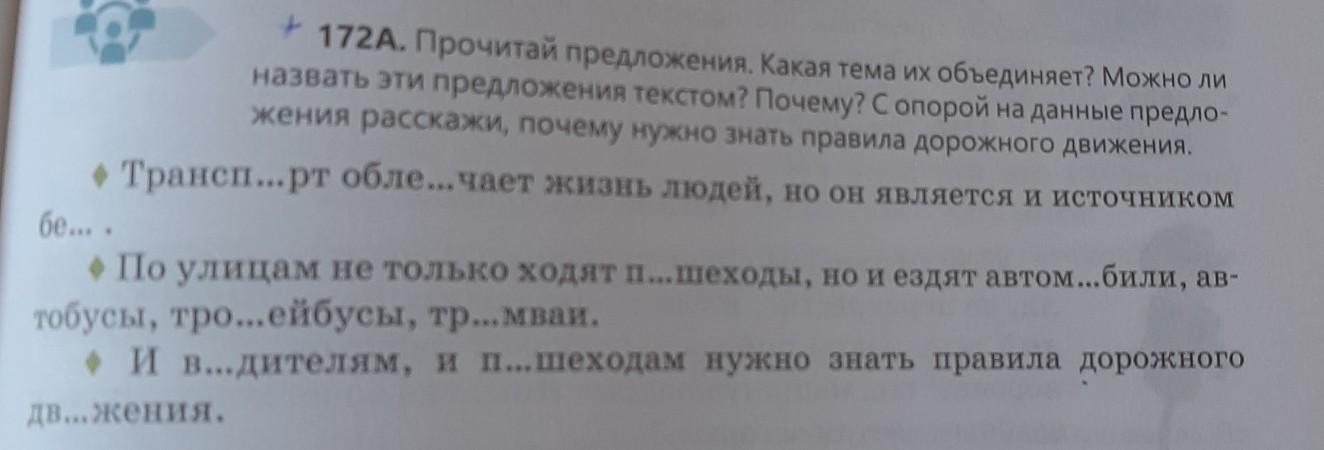 172A. Прочитай предложения. Какая тема их объединяет? Можно ли назвать эти предложения текстом? Почему? С опорой на данные предло- жения расскажи, почему нужно знать правила дорожного движения Трансп...рт обле...чает жизнь людей, но он является и источником бe... . 4 По улицам не только ходят п...шеходы, но и ездят автом...били, ав- тобусы, тро...ейбусы, тр...мвай. 4 и в...дителям, и п...шеходам нужно знать правила дорожного И дв... жения.