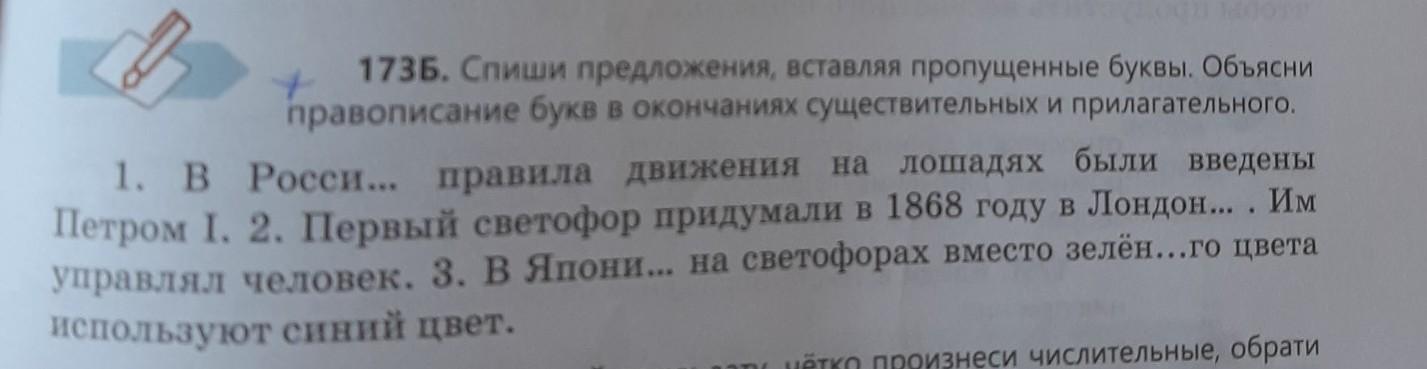 173Б. Спиши предложения, вставляя пропущенные буквы. Объясни правописание букв в окончаниях существительных и прилагательного. 1. В Росси... правила движения на лошадях были введены Петром I. 2. Первый светофор придумали в 1868 году в Лондон.... Им управлял человек. 3. В Япони... на светофорах вместо зелён...го цвета используют синий цвет.