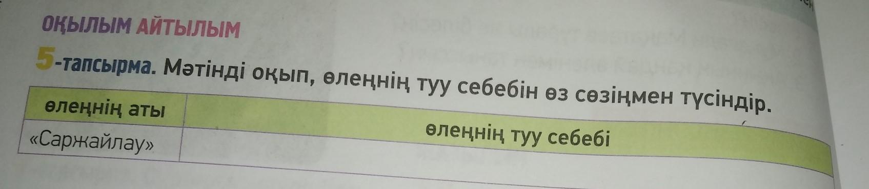 ОҚЫЛЫМ АЙТЫЛЫМ 5-тапсырма. Мәтінді оқып, өлеңнің туу себебін өз сөзіңмен түсіндір. өлеңнің аты өлеңнің туу себебі «Саржайлау»