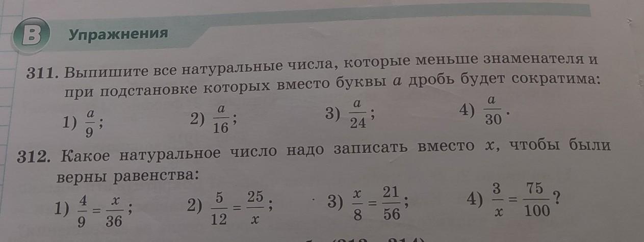 О. а Упражнения 311. Выпишите все натуральные числа, которые меньше знаменателя и при подстановке которых вместо буквы а дробь будет сократима: 2) 3) 4) 16 30 312. Какое натуральное число надо записать вместо х, чтобы были верны равенства: 4 5 25 21 3 75 1) 2) 3) x ) 4) ? 9 36 12 8 56 100 1) ; а 3 24 т орые х х 7